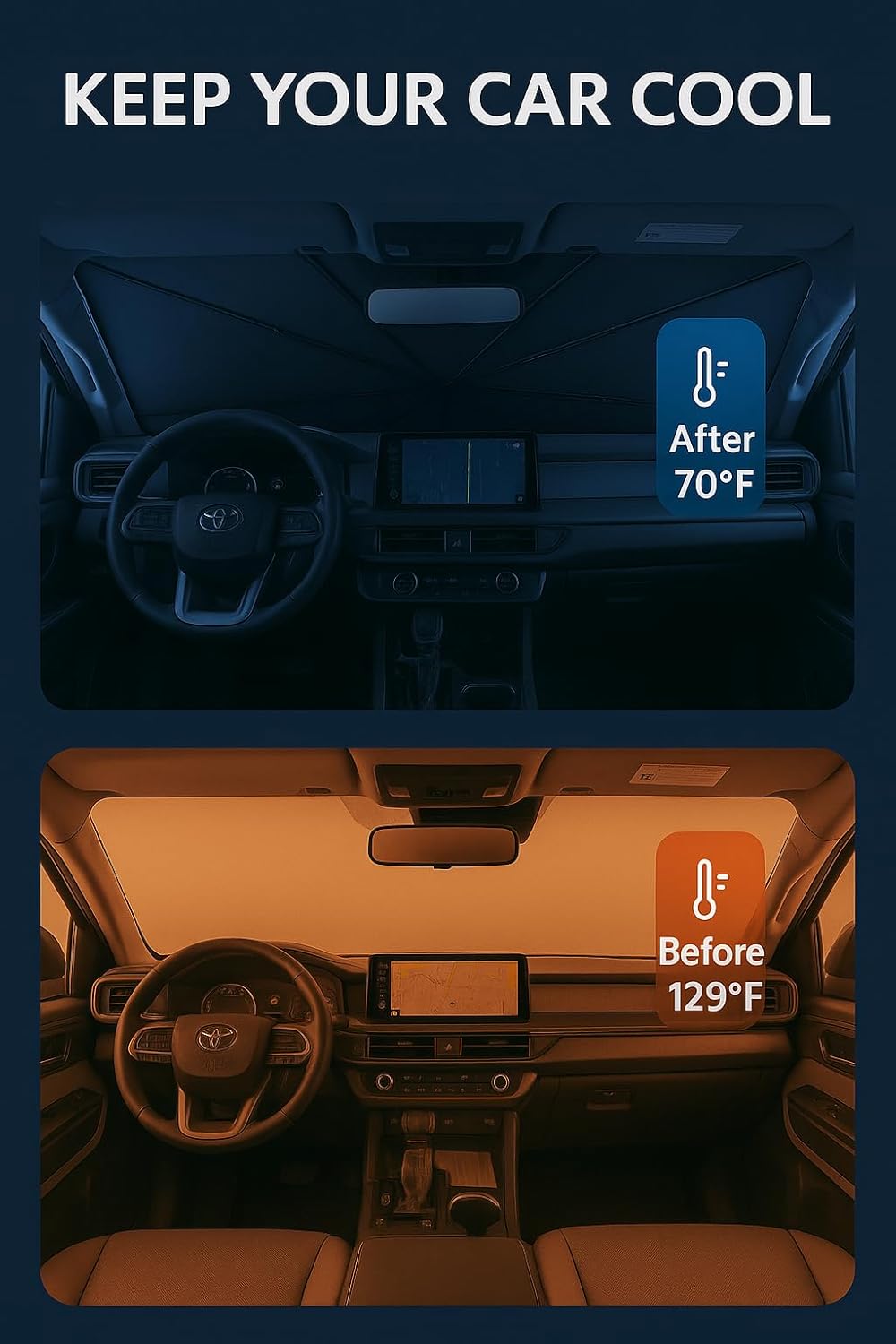 - Innovative Ice Crystal Material: The sunshade adopts a 4-layer design, which is thick enough to effectively block and reflect sunlight. After multiple uses, it is still strong and not easy to tear. The sunshade also uses innovative ice crystal materials to evenly distribute heat, quickly cool down, and keep your car cool all the time. You no longer have to worry about getting your seat or car handle scalded by high temperatures.