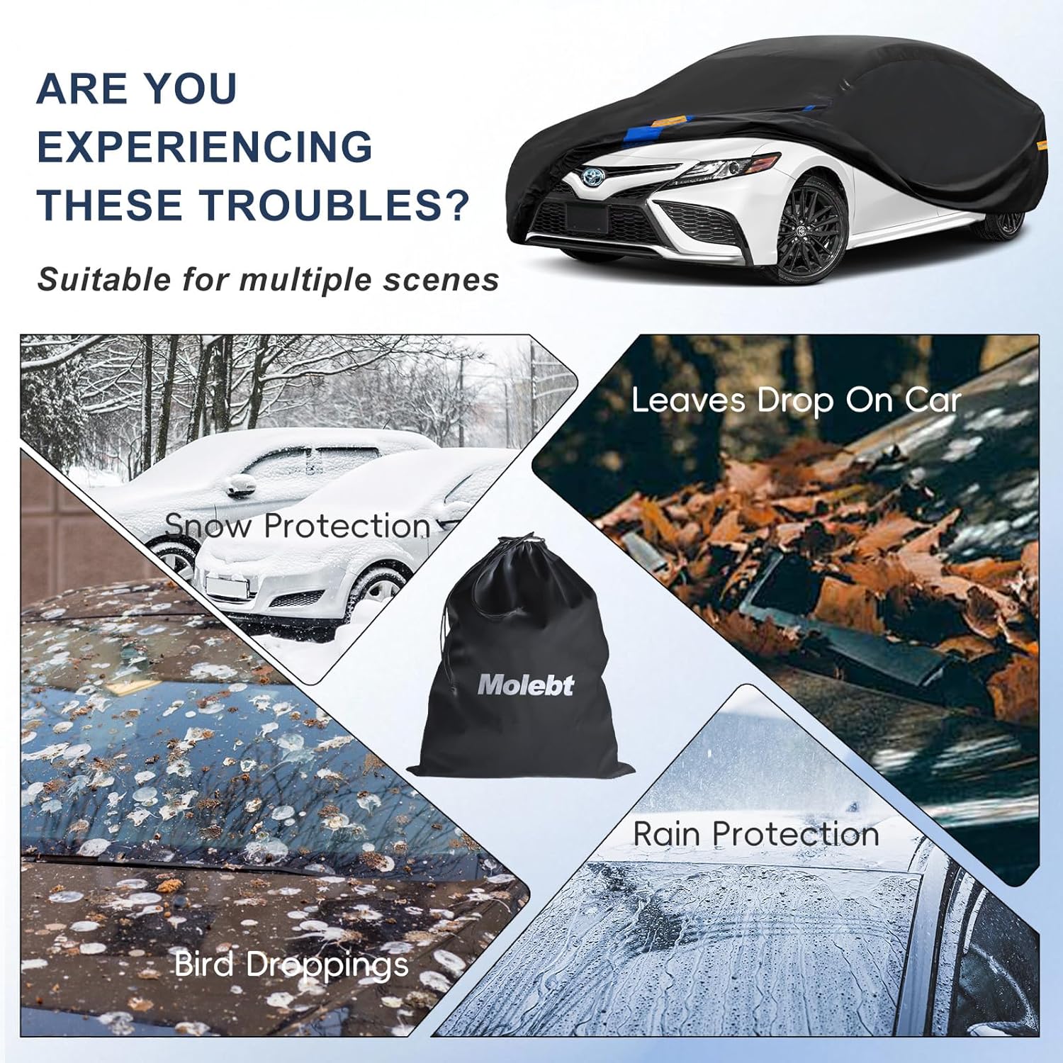 - 【All-Season Protection: Total Weather Defense】Molebt Sports Outdoor Car Cover is designed to provide year-round protection for your vehicle. Whether it's spring pollen, summer heat, autumn leaves, or winter snow, it reliably shields against dust, pollutants, bird droppings, acid rain, UV rays and heavy rainstorms.