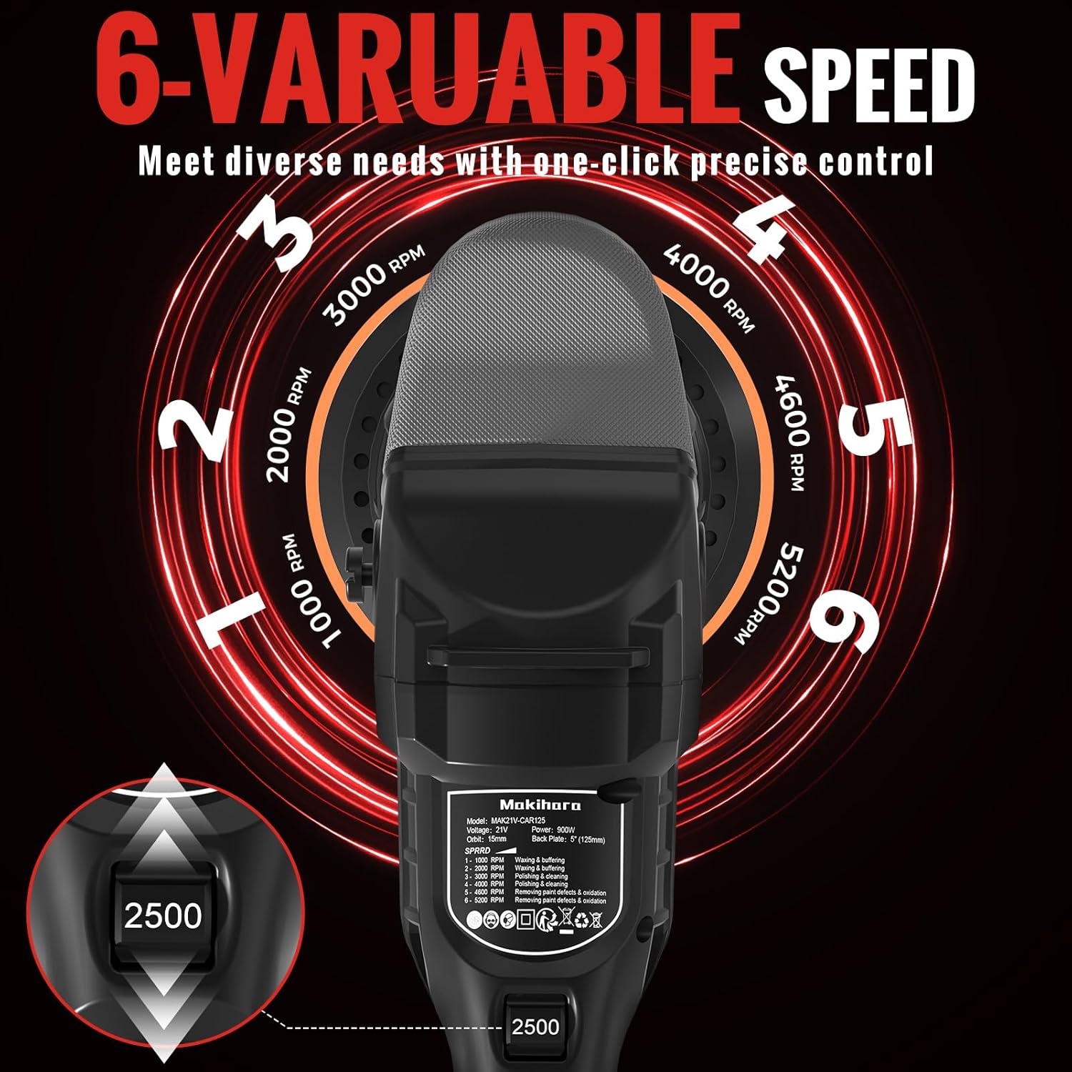 - 【6-SPEED VARIABLE】Portable cordless Buffer Polisher machine With 6 speed adjustable function.Range from 1000 to 5200RPM.Choose lower speeds (1-2) 1000-2000RPM:for waxing and buffing; medium speeds (3-4) 3000-4000RPM: for polishing and cleaning; and higher speeds (5-7) 4600-5200RPM: for effectively removing paint defects and oxidation. The 6-speed adjustment feature is designed to accommodate a variety of work requirements, including but not limited to automotive, marine sanding, furniture finishing, and flooring applications.