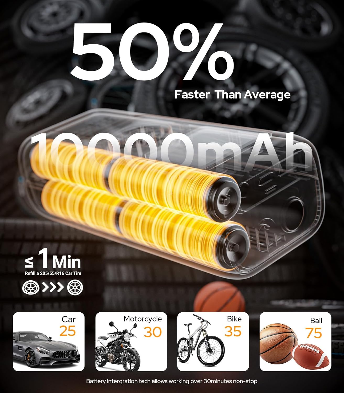 - Turbo Inflation & Powerful Battery: The tire inflator features a 22mm copper motor cylinder and 10000mAh battery for impressive endurance and function. Up to 160PSI, 48L/Min airflow outperforms, ensure 5X faster fully inflate 205/55/R16 tires within 1min, non-stop filling 4 tires with unique graphene dual-core cooling keeps the surface temperature cooler and safe. Ready for Every Journey, Reliable for Every Mile
