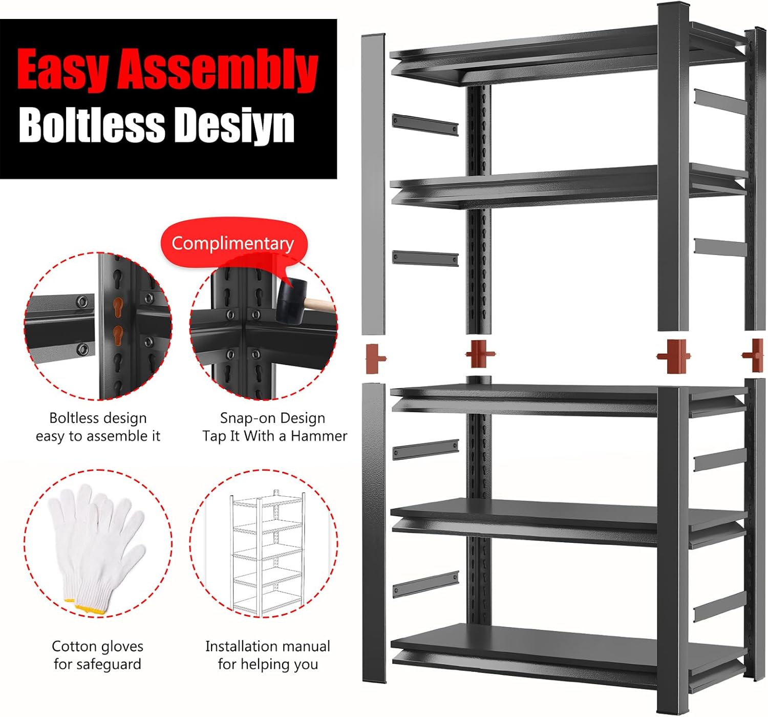 - 【10-Minute Easy Assembly & Thoughtful Service】No nuts or bolts needed—effortlessly assemble each standalone garage shelf in minutes! To simplify setup, we include a hammer and gloves. Plus, enjoy 24/7 customer support with every purchase. If any parts are damaged or missing, contact us for a swift resolution within 24 hours
