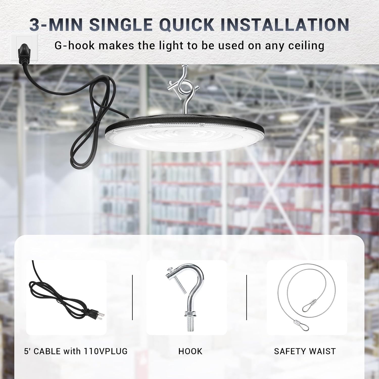 - 【Easy & Quick Installation】This UFO Led High Bay Light can be easily installed in seconds with the 5FT power cord provided and the built-in hook.It comes with US plug with which you can plug to the power directly, safe and secure for extremely easy installation. Ideal indoor lighting,This LED highbay light can work under power supply of 120VAC