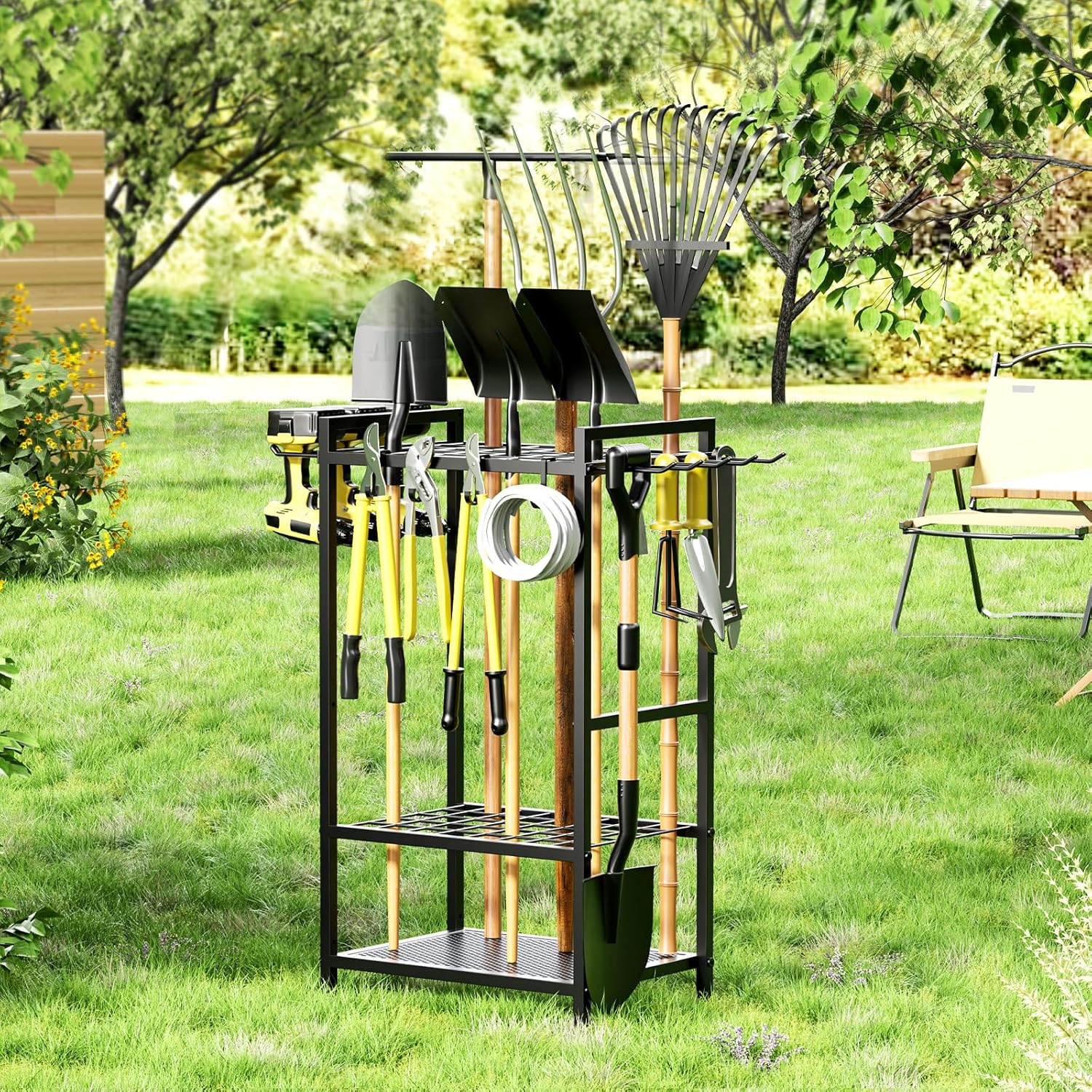 - 【Widely used and holds all tools】: This garden tool storage can be easily moved and placed wherever tools are needed, such as garages, gardens, sheds, and backyards. Custom-built to store gardening, yard, cleaning, and lawn tools, it easily accommodates items like shovels, pitchforks, rakes, dethatchers, pickaxes, mauls, brooms, and more, ensuring everything is in one place and readily accessible. It simplifies tool storage and organization, enhancing space utilization and work efficiency.