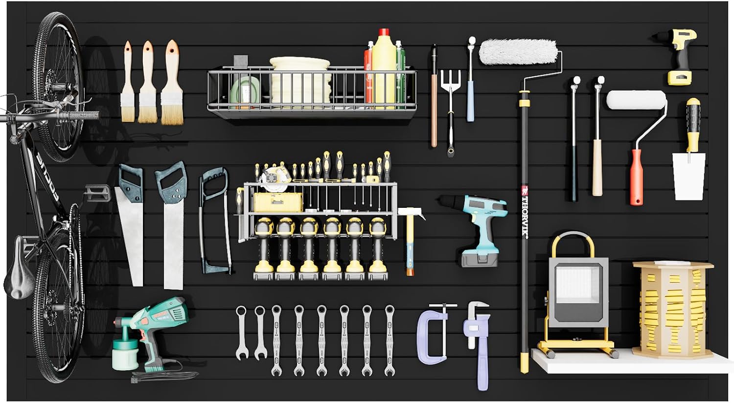 - Maximize Your Space: Unlock the full potential of your garage with our wall organizer system, designed to optimize vertical space. Transform your cluttered garage into a well-organized and efficient area. Say goodbye to mess and hello to a fully optimized space where your tools, equipment, and accessories are easily accessible, creating a visually appealing environment.