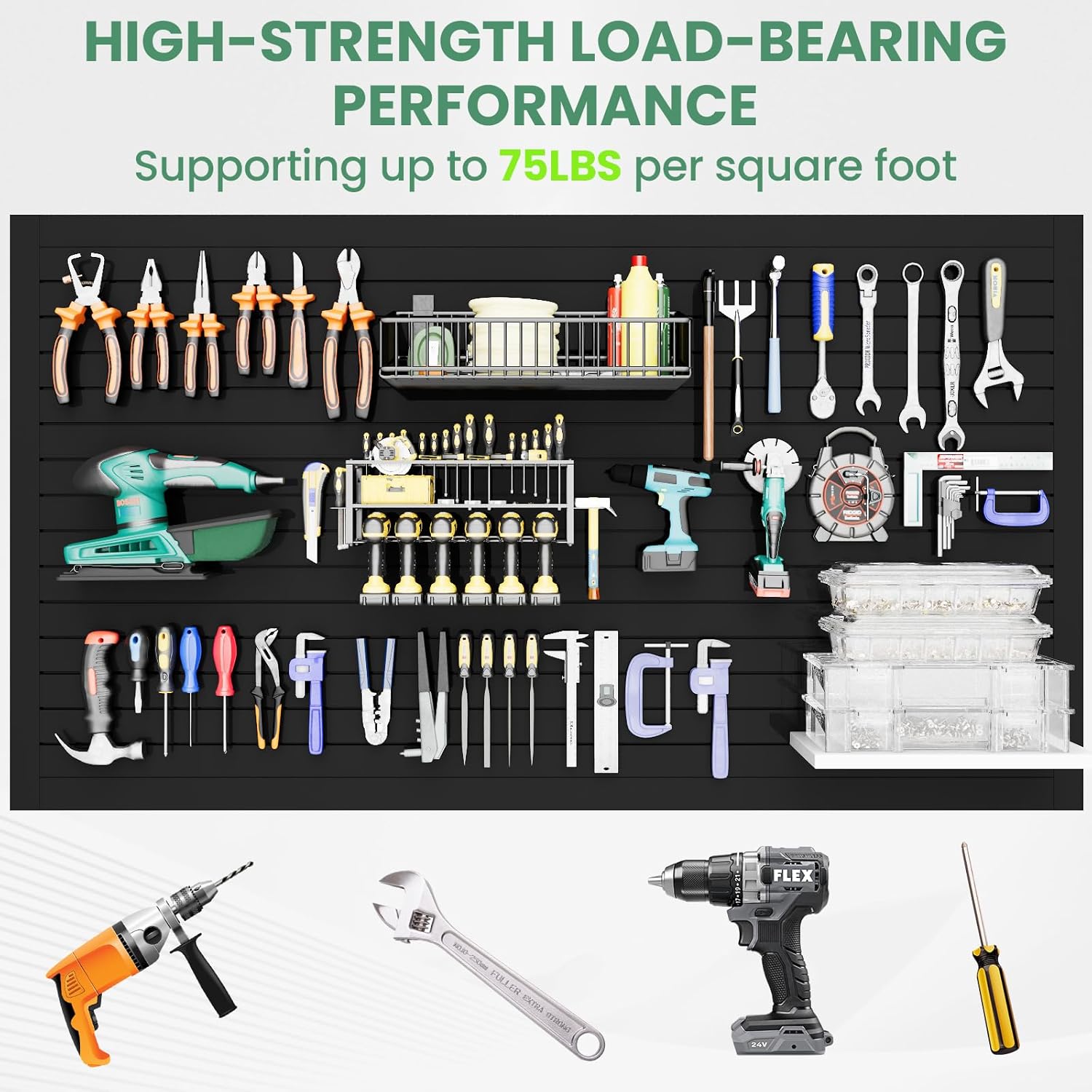 - Ladder & Bike Rack Storage Solution: The system includes eight 4ft x 1ft slat wall panels, covering 32 square feet. You can mix and match these panels to customize your setup. For additional storage, you can expand by adding more panels to accommodate your evolving storage needs, giving you the flexibility to craft the perfect configuration.