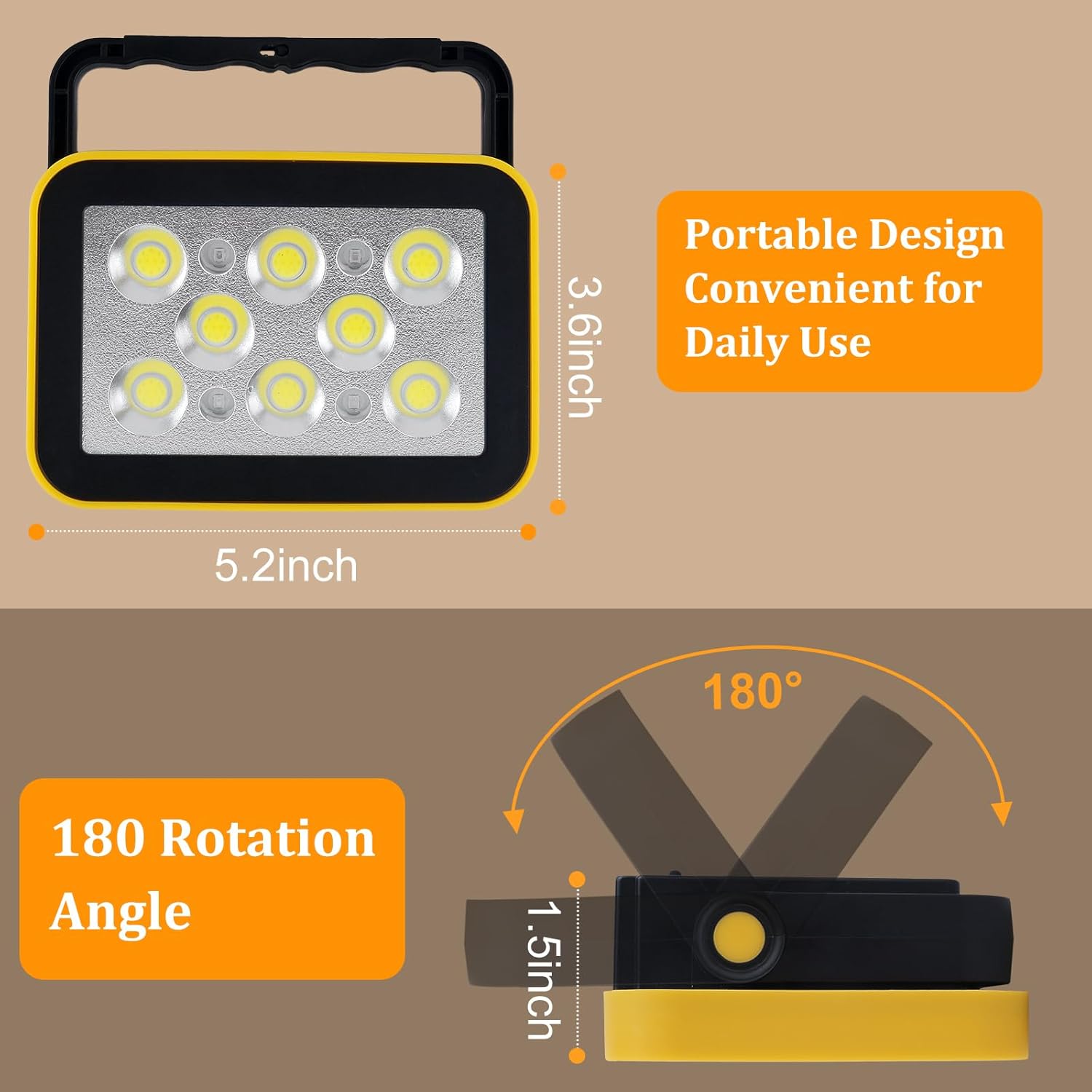 - COB Led Chips: With an ultra-bright COB LED light source, our portable outdoor lamp adds brilliance to your workspace. 180°Handle design can adjust the direction and angle of the light for enhanced illumination coverage