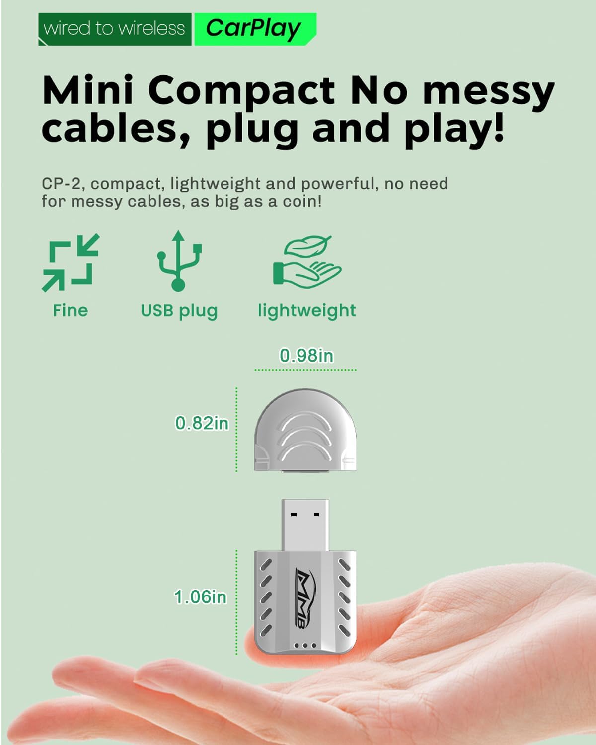 - Extremely compact design – 60% Smaller - MMB CP-2 MINI Wireless CarPlay adapter Whether it is a USB or Type-c port, almost all of them can be hidden in the port, blending seamlessly into your vehicle’s interior for a clean, Say goodbye to tangled cables,Improve driving experience.