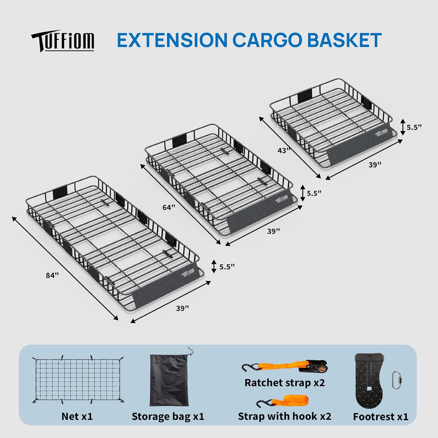 - 【Expandable Design】Two practical sizes of luggage racks are provided for selection: 39"×84"×5.5",39"×64"×5.5"or 39"×43"×5.5", and the length can be freely adjusted according to actual needs. Whether you need to carry large items during daily commuting or go on a family trip during holidays, it can be a perfect fit.