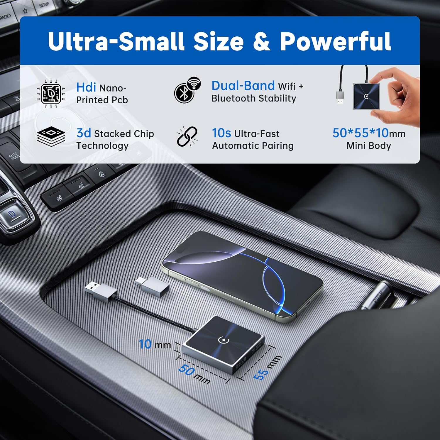 - ✅【Dual-Band WiFi & HDI PCB for Superior Stability】 Our wireless CarPlay adapter features advanced HDI (High-Density Interconnect) PCB and 3D chip stacking for ultra-stable performance. Dual-frequency WiFi transmission (2.4GHz & 5GHz) ensures high bandwidth, fast loading, and low latency. The nano-printed circuitry improves signal quality while ensuring tighter integration and enhanced durability in all car environments.