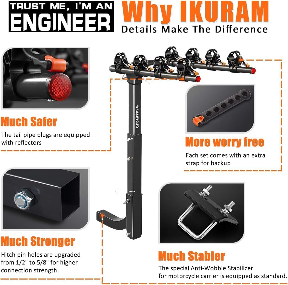 - More Accessories: This bike hitch rack comes with strap, hitch tightener and locking hitch pin.