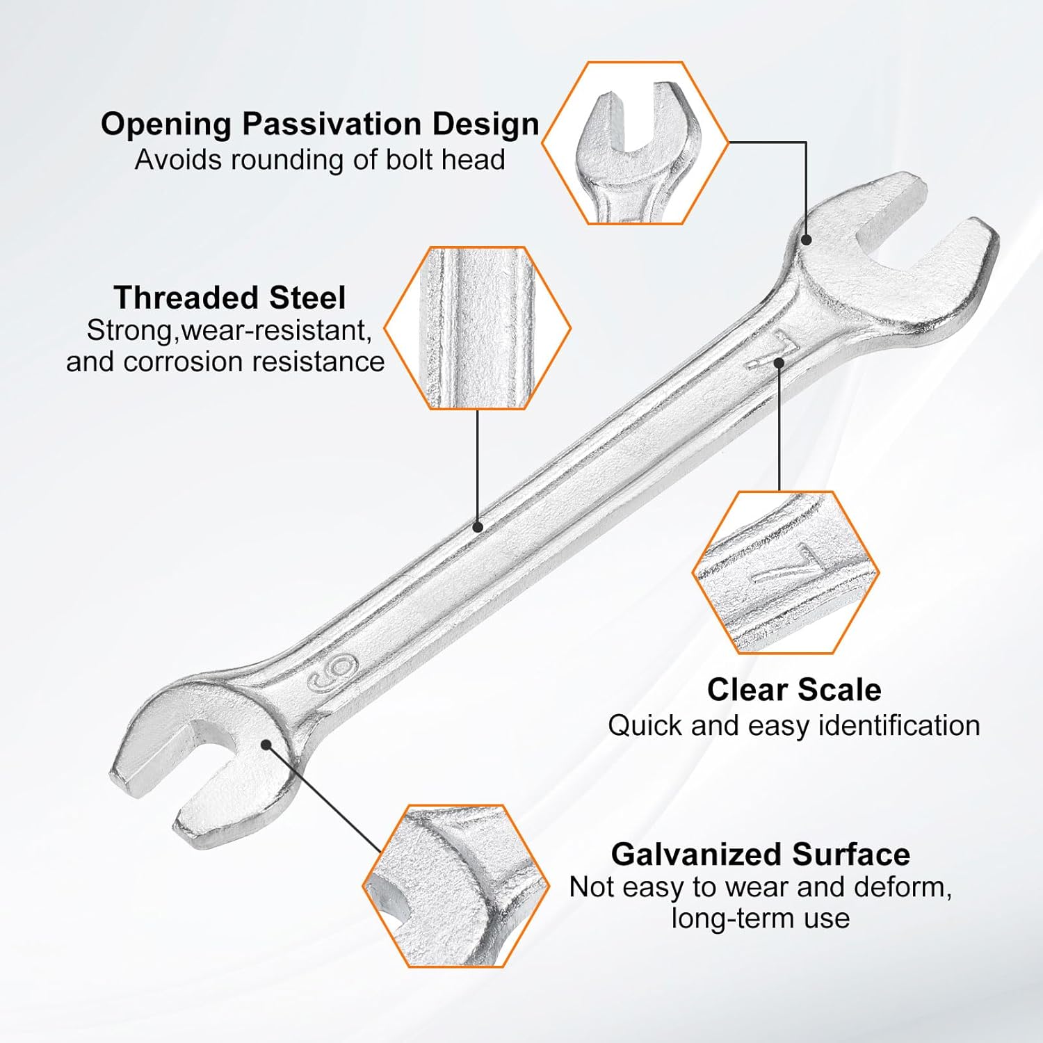 - Material - Our double open-end wrench is made of threaded steel with high hardness and excellent wear resistance. The surface galvanizing improves its wear resistance, keeps its surface smooth and reduces wear, is not easy to deform, and can be used for a long time.