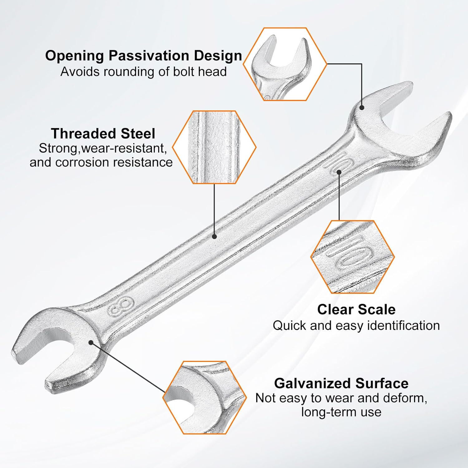 - Material - Our double open-end wrench is made of threaded steel with high hardness and excellent wear resistance. The surface galvanizing improves its wear resistance, keeps its surface smooth and reduces wear, is not easy to deform, and can be used for a long time.