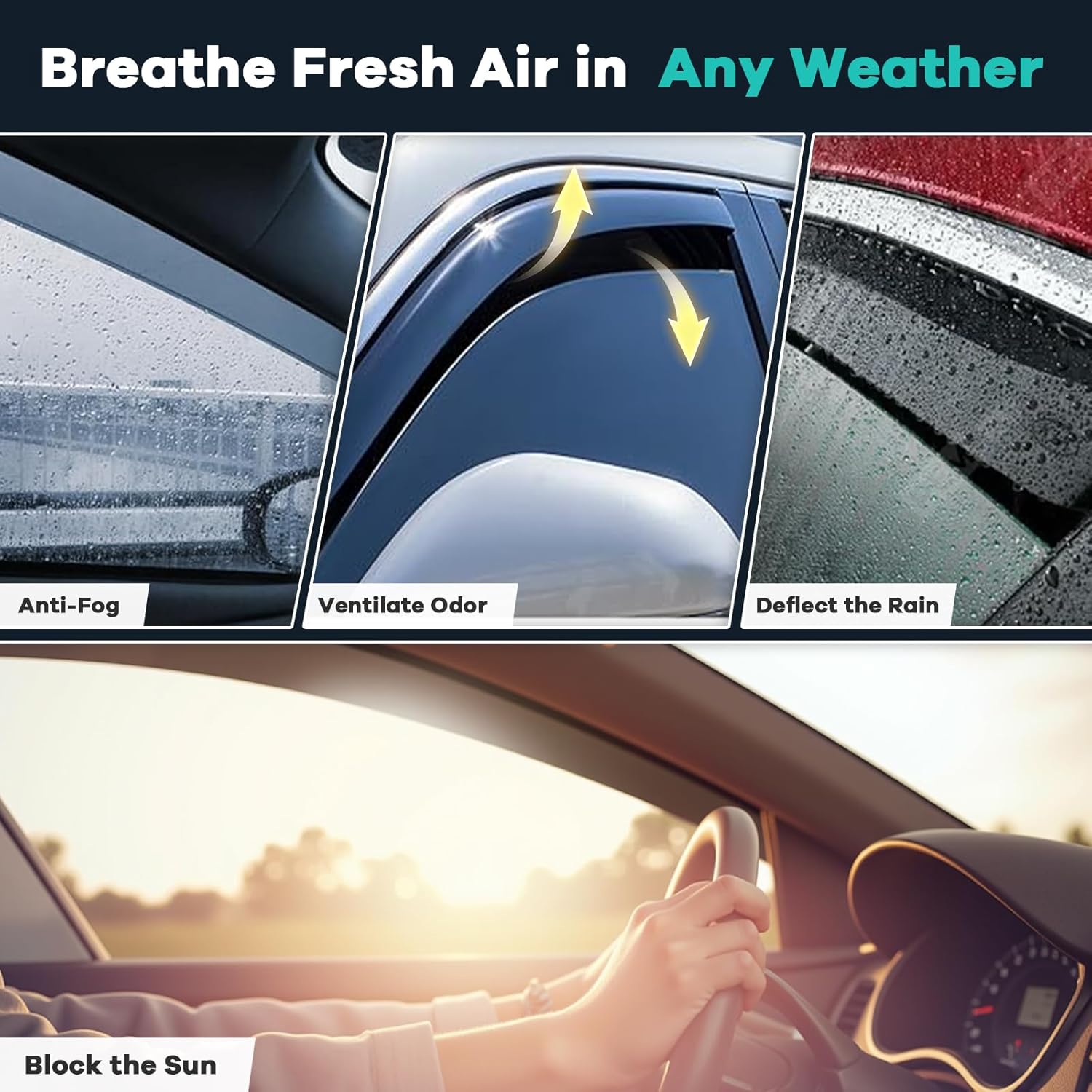 - 【Improved Ventilation and Air Flow】Allows fresh air to circulate through open windows while keeping the rain out or reduces heat. Reduce mirror and window fogging; reduce sun glare through side window. Dark Smoke translucent color will not obstruct the driver's view while driving