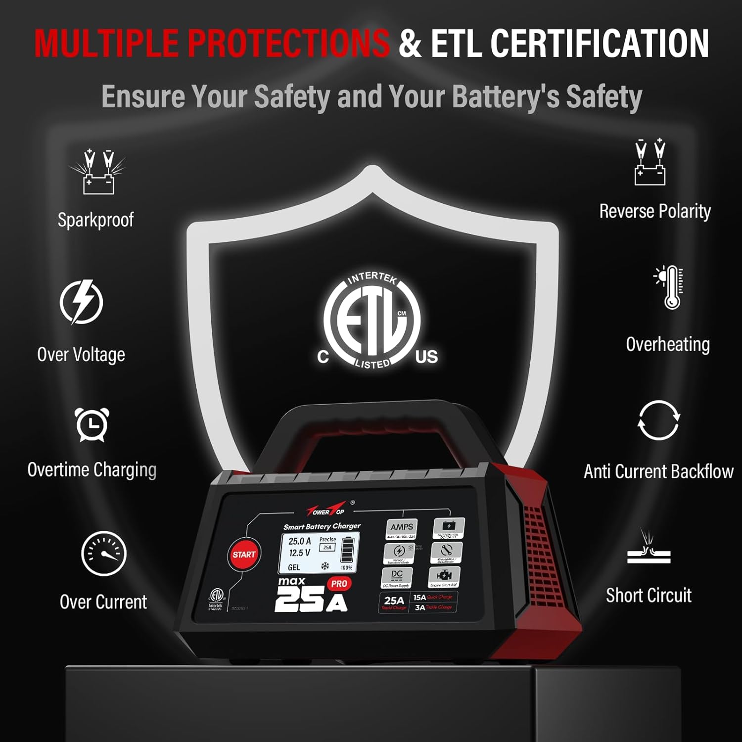 TowerTop 25A Max Pro Battery Charger: 12V Fully Automatic Smart Trickle Charger, Automotive Battery Maintainer with Engine Start, DC Supply, Winter Mode, Recondition,Desulfation, for Lead Acid/Lithium