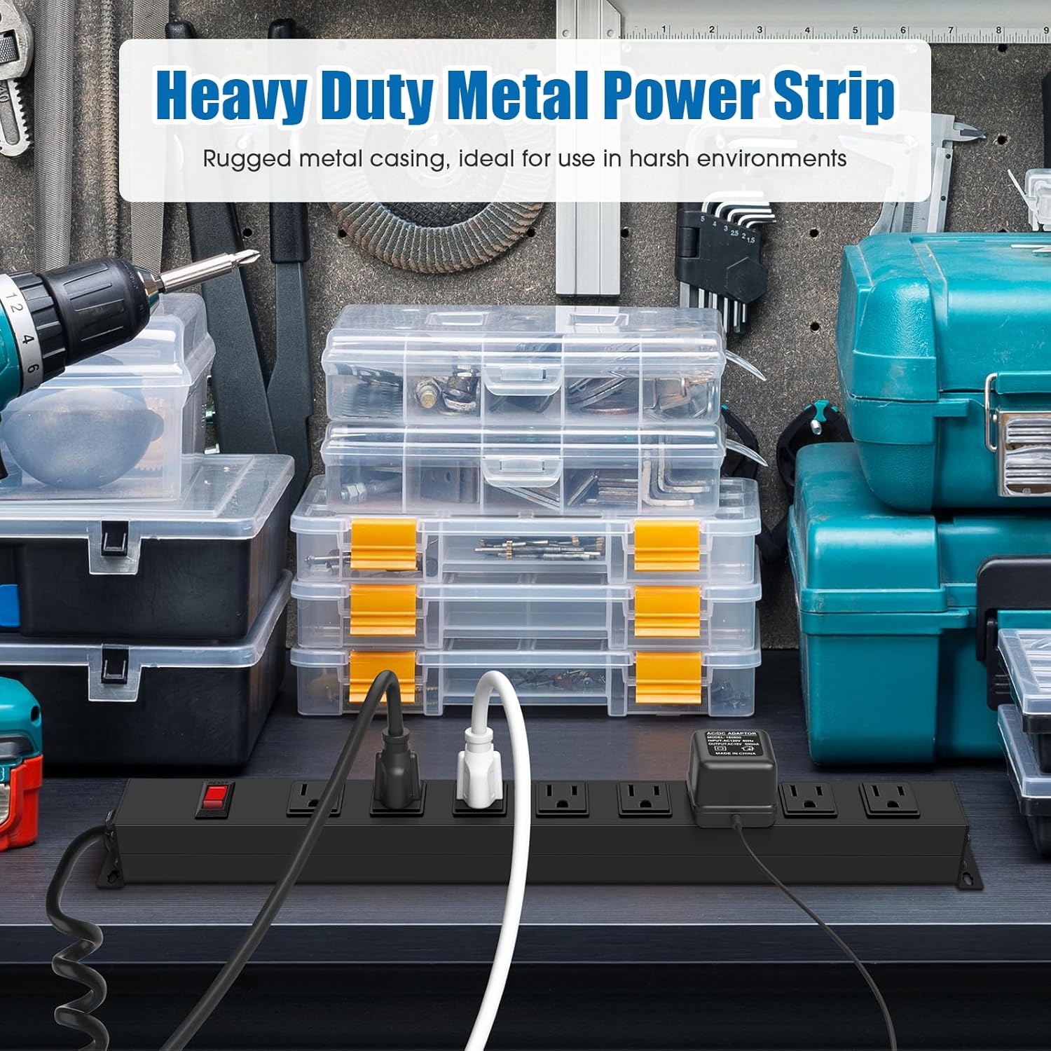 2Pack 8 Outlet Metal Wall Mount Power Strip, Mountable Outlet with Switch, Heavy Duty Wide Spaced Surge Protector, 4 FT SJT 14AWG Black Spring Cord.