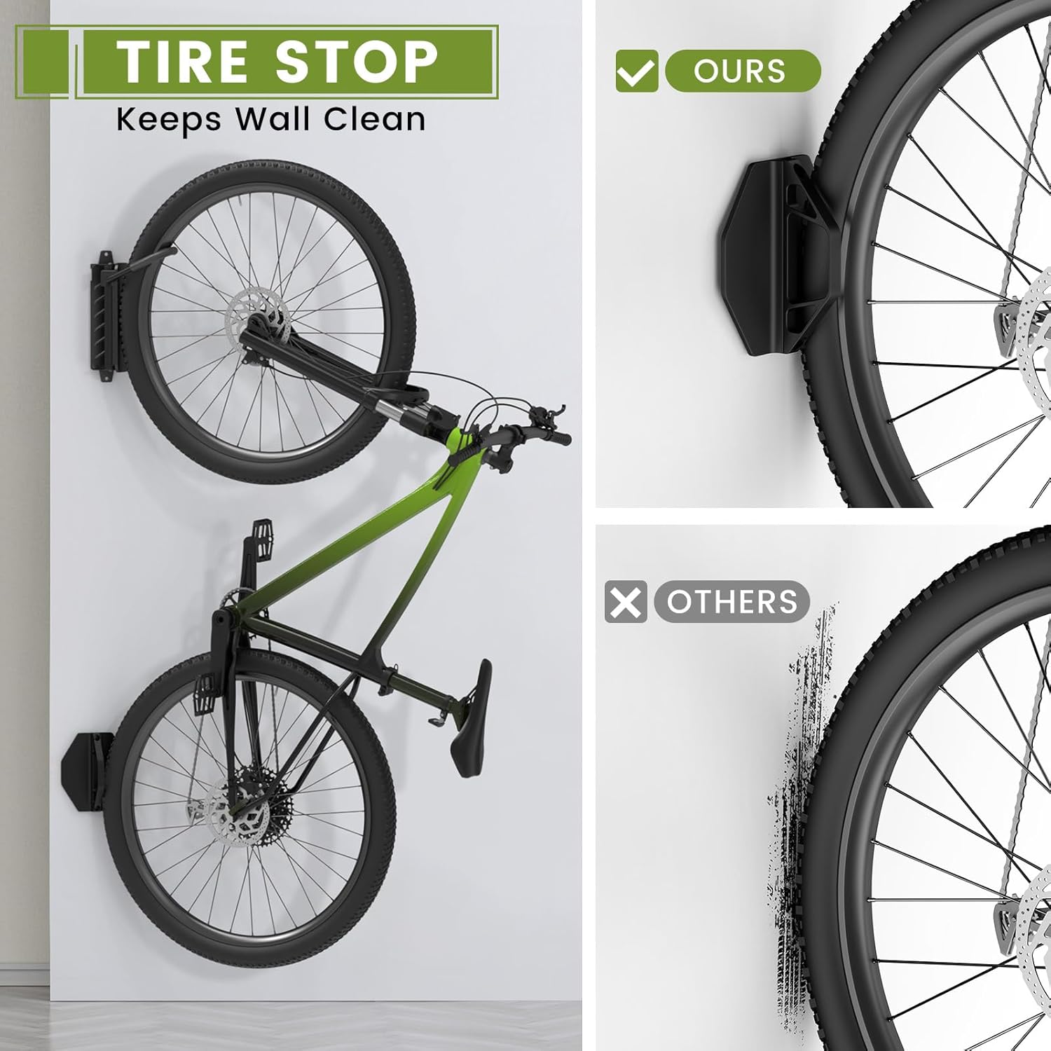 - 【Save Space - 150° Swivel Design】 Swivel design with bearing system, bike storage rack easy to store your bikes in the center, left, or right angle position, offering a convenient storage solution for parking around your car and in your apartment. The swivel system also allows you to store your bikes close to the wall. Simply hang the front wheel in place, place the rear wheel on the stabilizer, and rotate the bike wall rack to the desired angle.