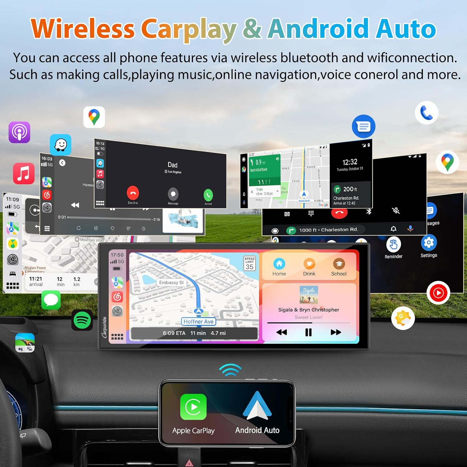 - 【Seamless Integration with Smartphone(IOS/Android)】 CARPURIDE 11.26" portable car stereo compatible with Carplay & Android Auto. After link wirelessly, puting all your phone’s best features in a clean, safe, and easy-to-use hd touchscreen, wirelessly handle gps navigation, messaging, phone calls, bluetooth music, Siri. Compatible with IOS 6 and above, Android 11 and above.