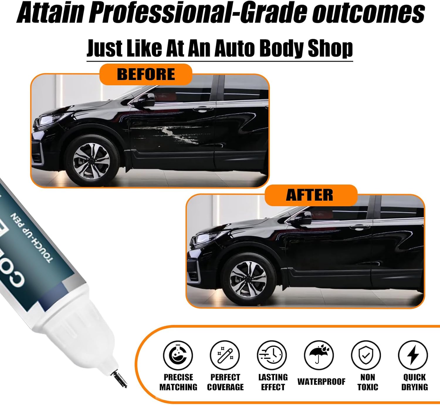 - 【Repair scratches quickly and simply】This car scratch repair paint has strong adhesion, anti-rust, and waterproof properties that protect your car's surface from further damage. With a 2-in-1 uses design, each bottle of car paint comes with a pen pin and brush, ensuring a hassle-free application
