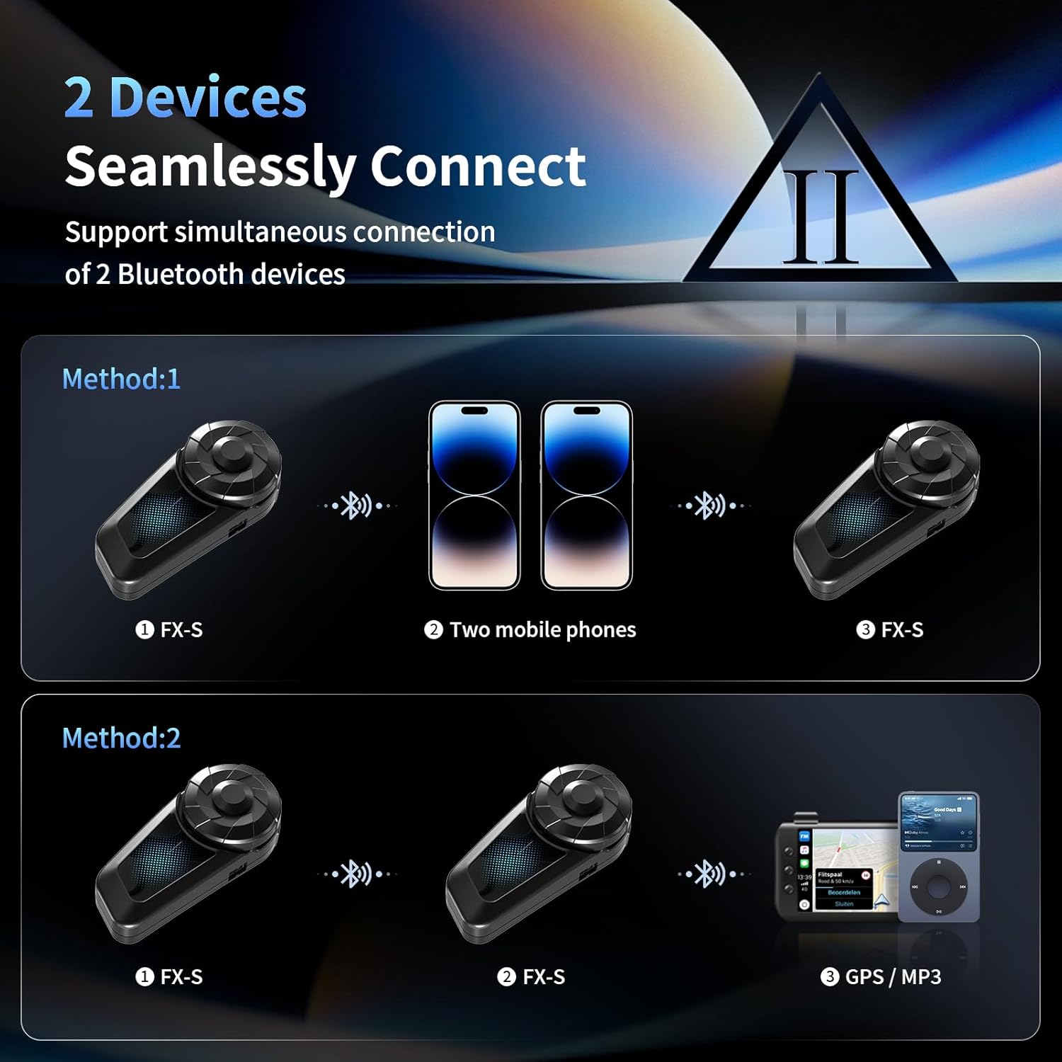 - Smart Noise Reduction, 2 Phones Connected: FX-S motorcycle communication system utilizes CVC & DSP noise cancellation to effectively eliminate the effects of all types of noise and maintain the purest and clearest vocals. Supporting 2 phones connected, you can easily switch between them without frequently pairing