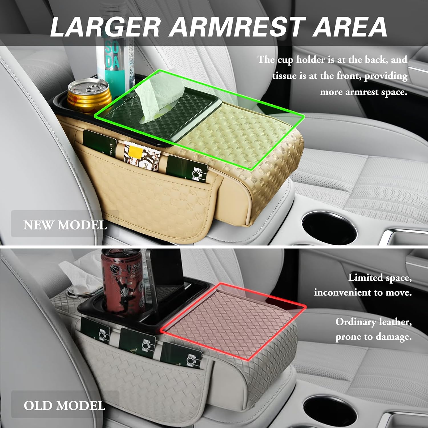 - 10" × 8" Extra-Large Armrest Area: We have designed a front tissue storage and rear cup holder to ensure that the armrest area remains spacious enough (allowing you to rest your arm on the tissue box) while still providing storage functionality, thus preserving the original purpose