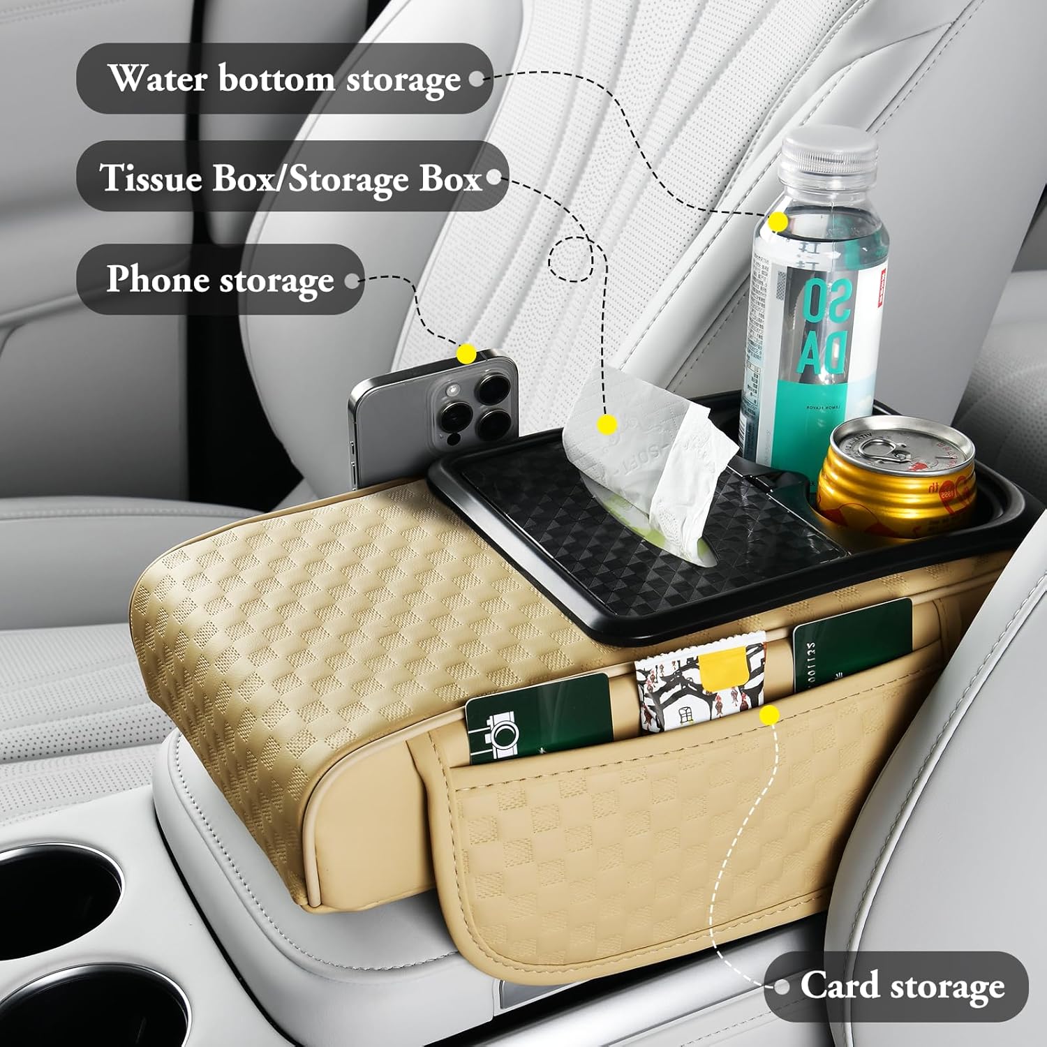- 4-in-1 Car Center Console Cover: This Armrest Cover provides both an armrest area and a storage space for common in-car items such as Water Cups, Tissues, Cards, and Phones. You no longer need to buy additional in-car organizer, ensuring your car stays clean and organized while being easy to use