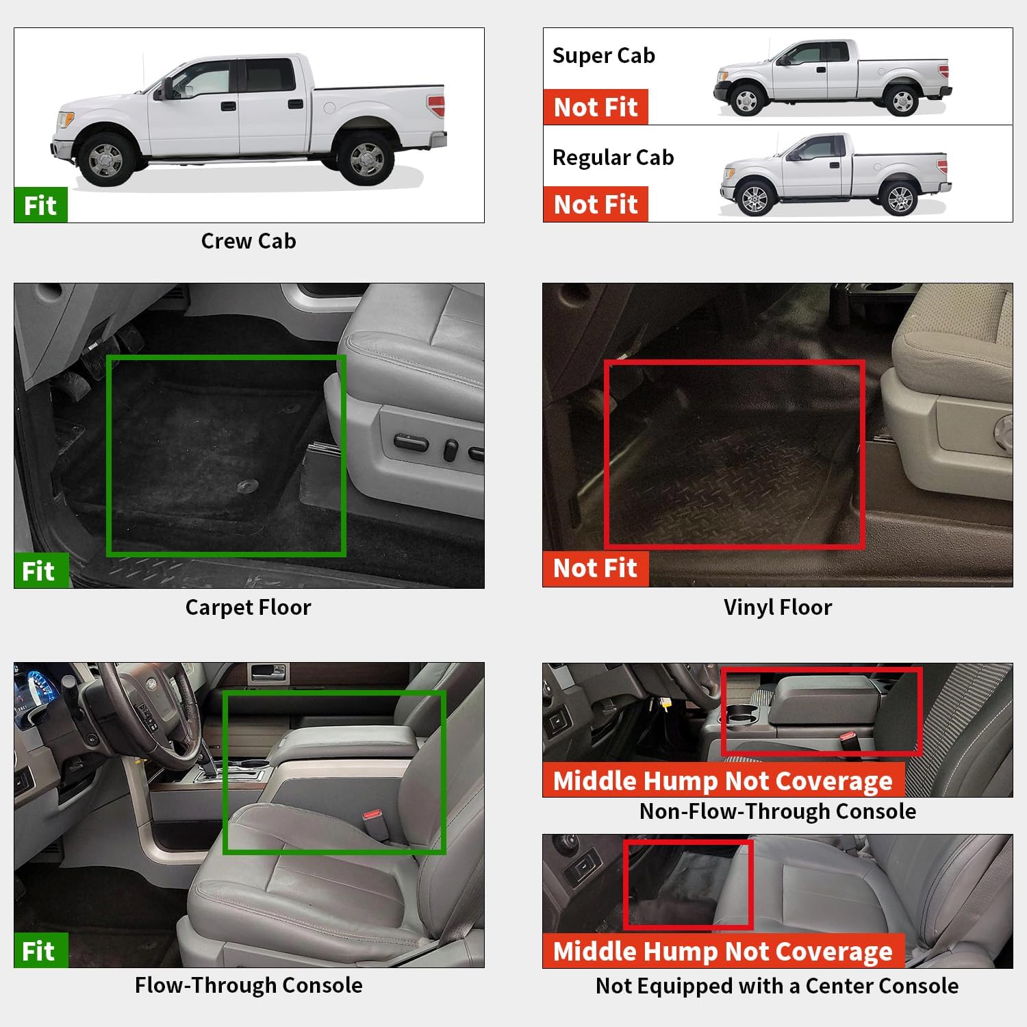 - FIT LIKE A GOLVE - LASFIT Floor Mats Custom fit for Ford F150 2011-2014 Super Crew Cab, Carpet Floor Front Row w/ Flow-Through Console, are precisely designed using real vehicle 3D scanning technology to ensure a vehicle specific fit, providing full coverage and protection for the driver, passenger, and rear seats, include the areas under the gas and brake pedals, the edges of the seat slide rails, and the door sill edges