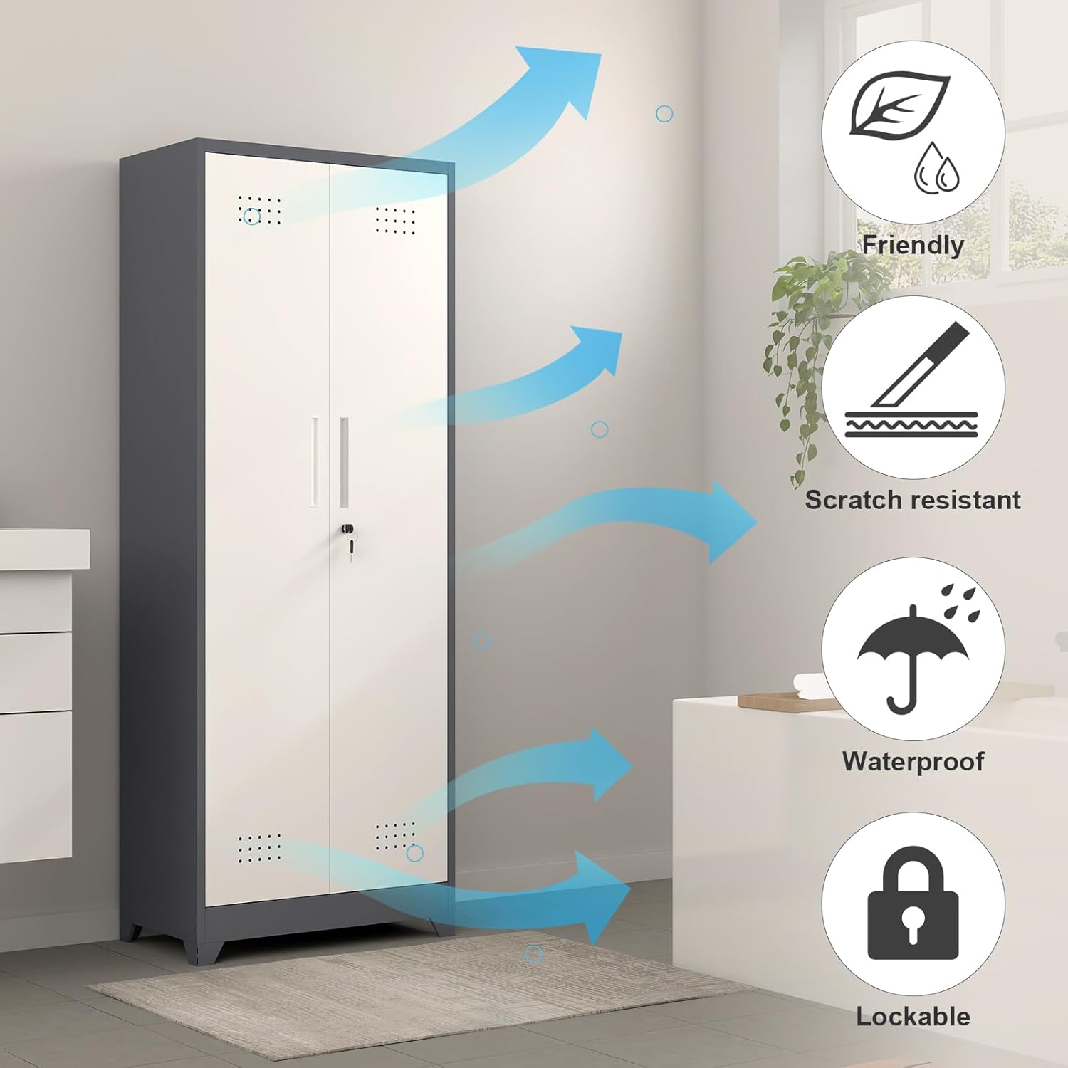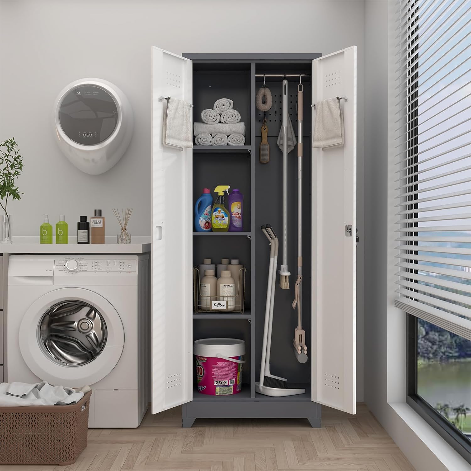 - 【User-Friendly Design】The bottom of the broom metal cabinets with locking doors and adjustable Shelves is made of stainless steel, which is corrosion-resistant and easy to clean. The ventilation holes on the panel prevent moisture and allow breathability, keeping the interior dry and reducing odors. The four standing feet enhance the stability of the cabinet and make it easier to clean underneath.