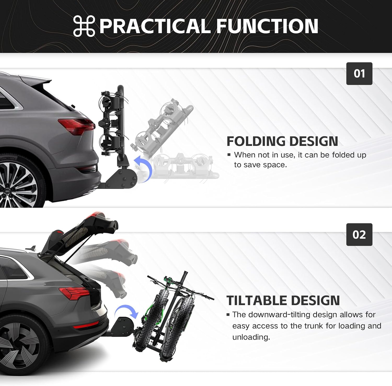 - 【Foldable and Tiltable Design】: This YZONA E-Bike Rack features a fold-up design for convenient storage when not in use, and it can be easily tilted downward for access to the trunk, facilitating the loading and unloading of cargo.