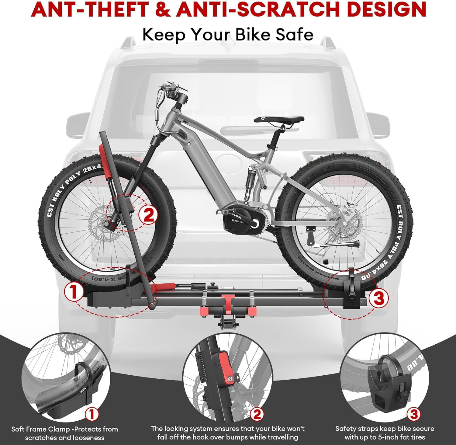 - Note: The wheel lock key is stick on the packaging material, please find it carefully. Dual-Layer Anti-Theft Protection – Our ebike hitch rack features a heavy-duty trailer hitch lock and a dual-arm locking system, ensuring maximum stability and security. Once engaged, the locking arms remain firmly in place, while the hitch pin lock keeps both your ebike and rack securely attached—preventing any unintended movement or detachment