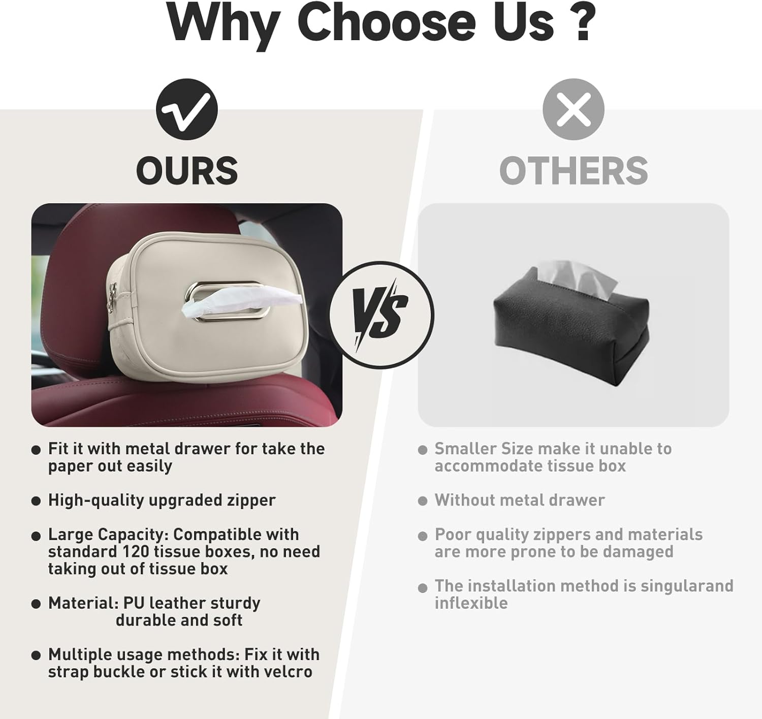 - 【Solve the Problems of Car Tissue】Because the tissue box is frequently tossed to the floor, trampled on, broken and Inconvenient for children to take a tissue, the car tissue holder , which is attached to the seat back of the vehicle with a strong strap buckle, is a preferable choice to help you solve the problems.