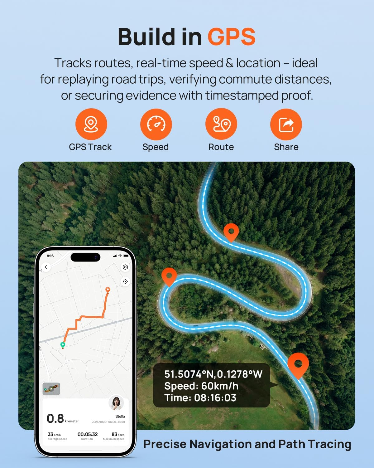 - 【Built-in GPS for Reliable Evidence】Drive with documented precision! This car dash cam's integrated GPS embeds coordinates, speed, and timestamps directly onto footage—creating court-admissible records while preserving your road trip memories. View routes via app or replay journeys with mapped data. Essential for resolving disputes or verifying travel logs. All critical details auto-saved without manual input