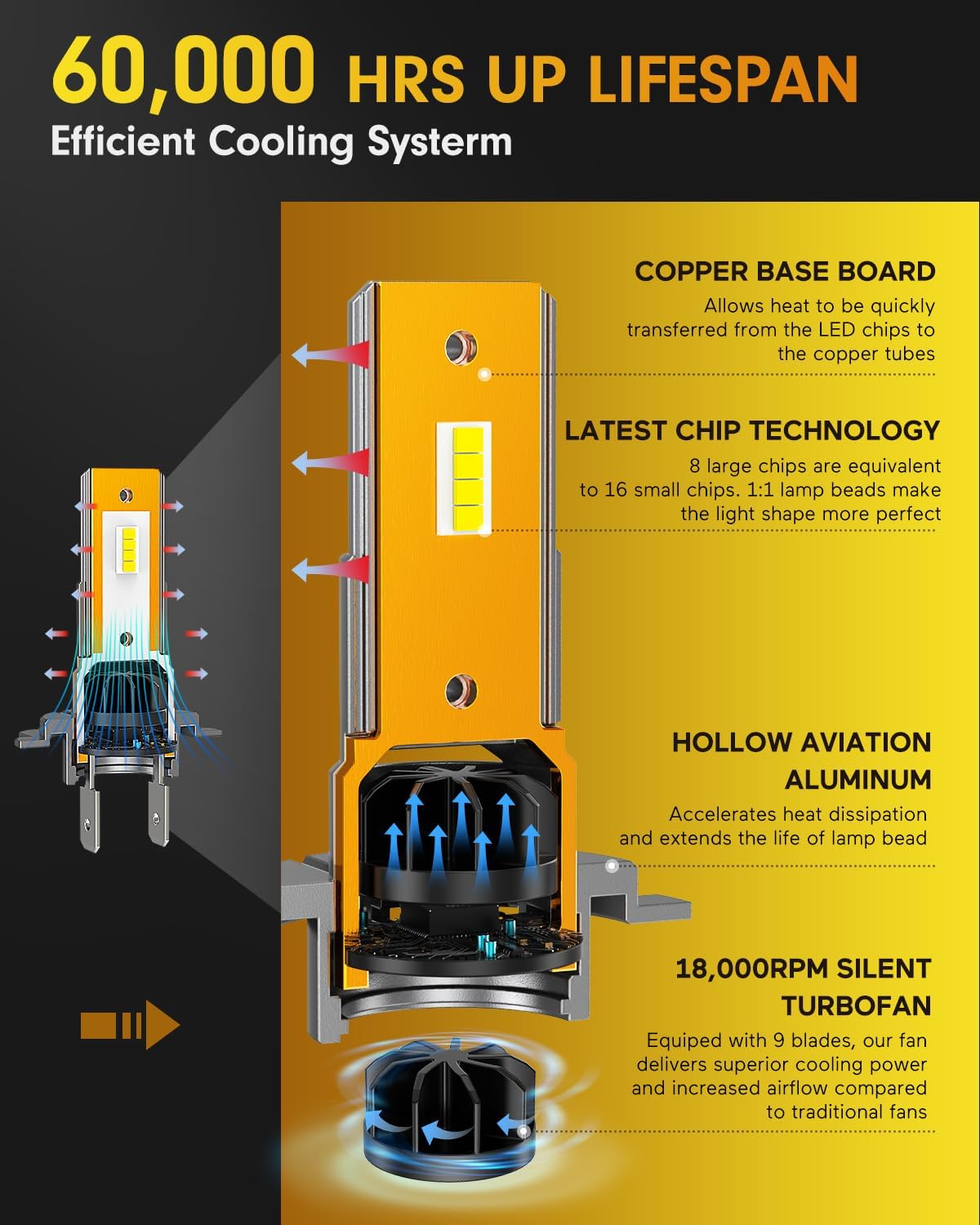 - γOver 60,000-hours LifespanγTake premium aviation aluminum as the main body, double copper base tube provide a large surface area for heat dissipation. The Heat Sink Fins and 1,8000RPM high speed cooling fan with 9-blade improve the cooling efficiency. This H7 bulbs can ensure a life span up to more than 60,000 hours continuous lighting and stable working. Say goodbye to frequent replacement.