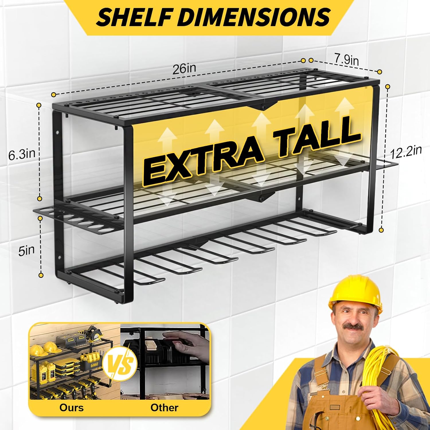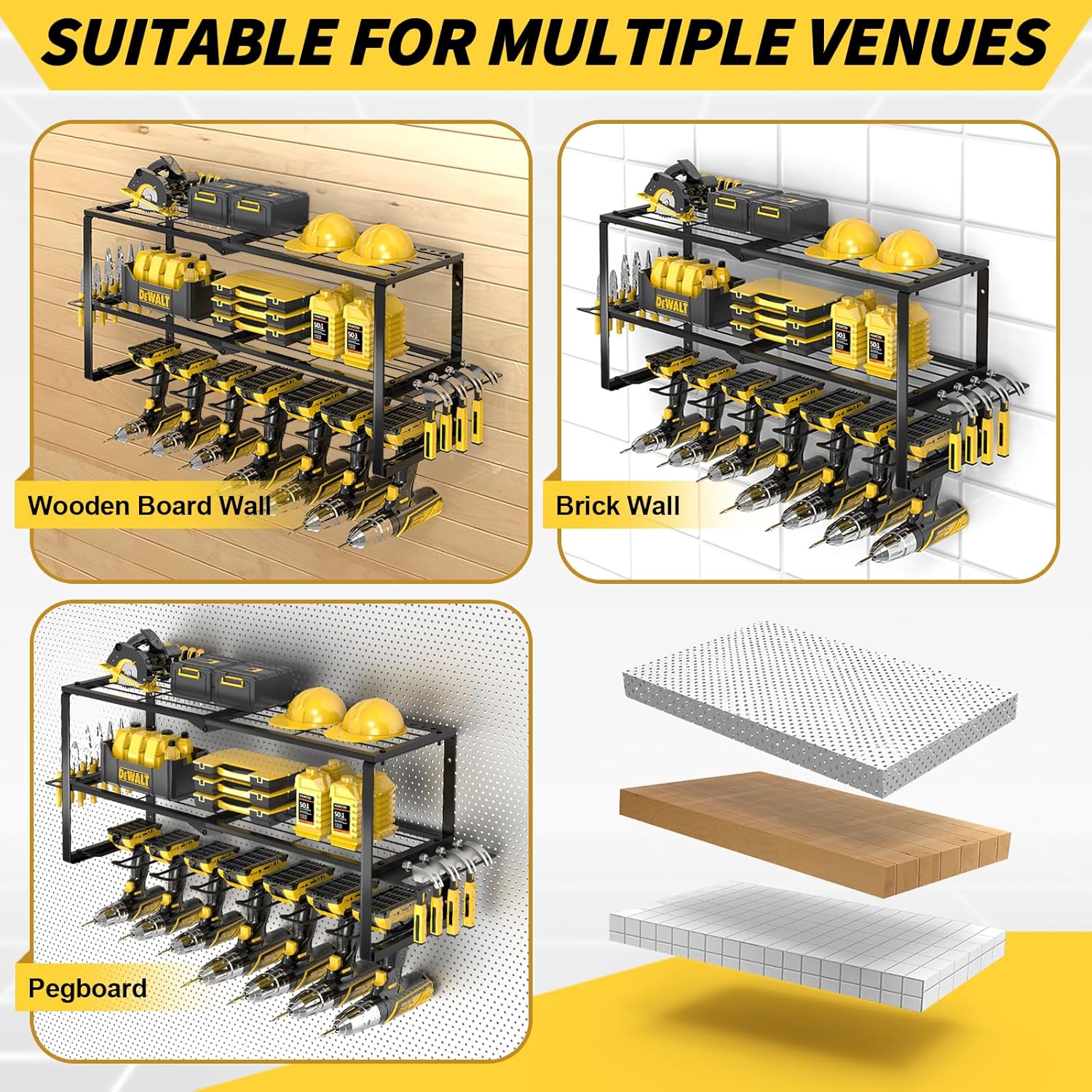 - 【Stronger Weight Capacity】The tool storage for garage organization is made of thickened heavy-duty steel metal for greater weight capacity and durability.We also used stronger and longer expansion screws, and the other screws were also larger, making the tool rack hang more securely on the wall and the drill storage wall mount more sturdy
