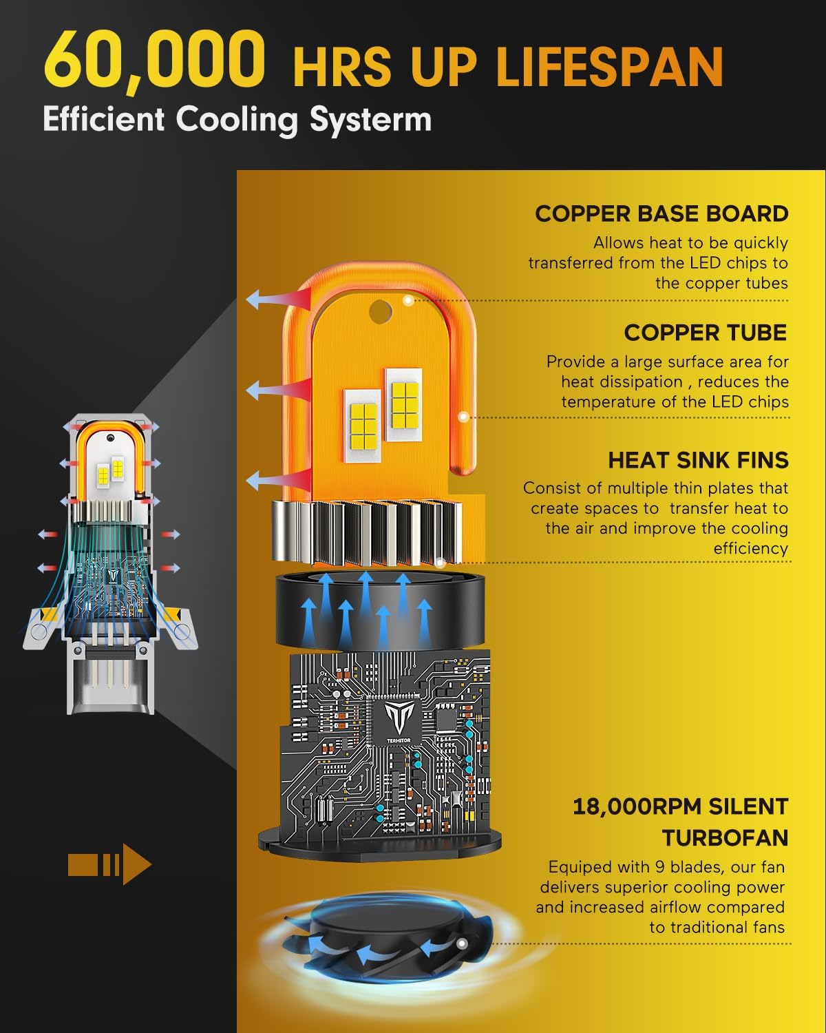 - 【Over 60,000 Hours Lifespan】Constructed with aviation-grade aluminum, dual copper heat pipes, and a high-speed 18,000RPM cooling fan, these bulbs offer efficient thermal management and long-lasting performance.