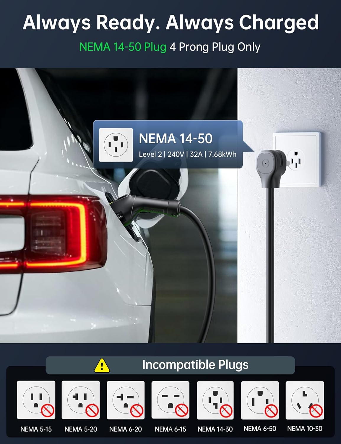 - [Important Notice] Raylix 32A level 2 ev charger requires a dedicated 240V/40A circuit and a 4-prong NEMA 14-50 outlet (North American electrical code compliant). This charger ONLY works with NEMA 14-50 outlets. NOT compatible with 10-30, 14-30, or 6-50 outlets. Please check before ordering.