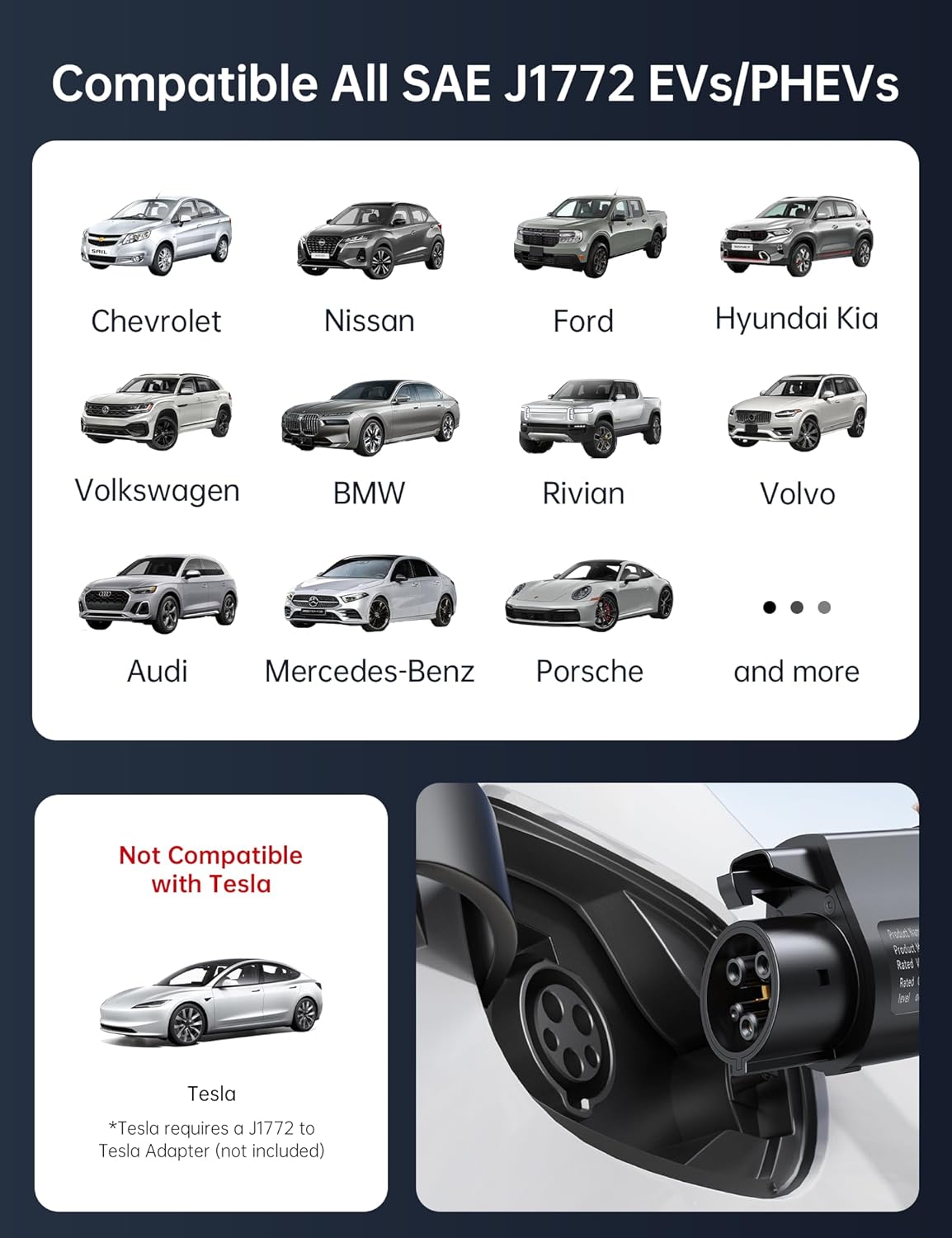 - [Universal Compatibility] With our charger, you can power up multiple vehicles, whether it's your car, your friends', or your family members'. Compatible with all electric vehicles and plug-in hybrids using the SAE J1772 connector, including GM, Nissan, Audi, Kia, Honda, BMW, Hyundai, and more. For Tesla vehicles, just use a J1772 to Tesla adapter (sold separately). Perfect for home, travel, or when hosting guests, ensuring everyone's EV is always ready to go!