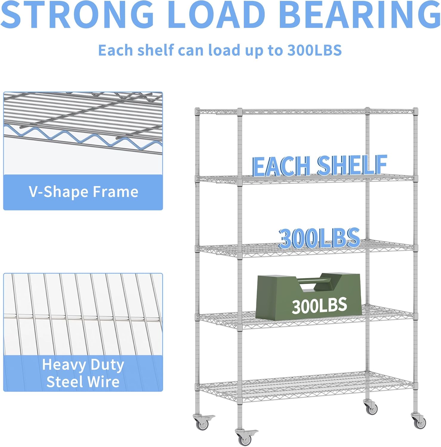 - 【Easy Mobility & Stable】This metal wire shelving provides two modes of standing support. 2 rotatable wheels & 2 brake wheels enhance mobility, while 4 adjustable feet ensure stability on uneven floors—great for industrial shelving and home shelving storage use.