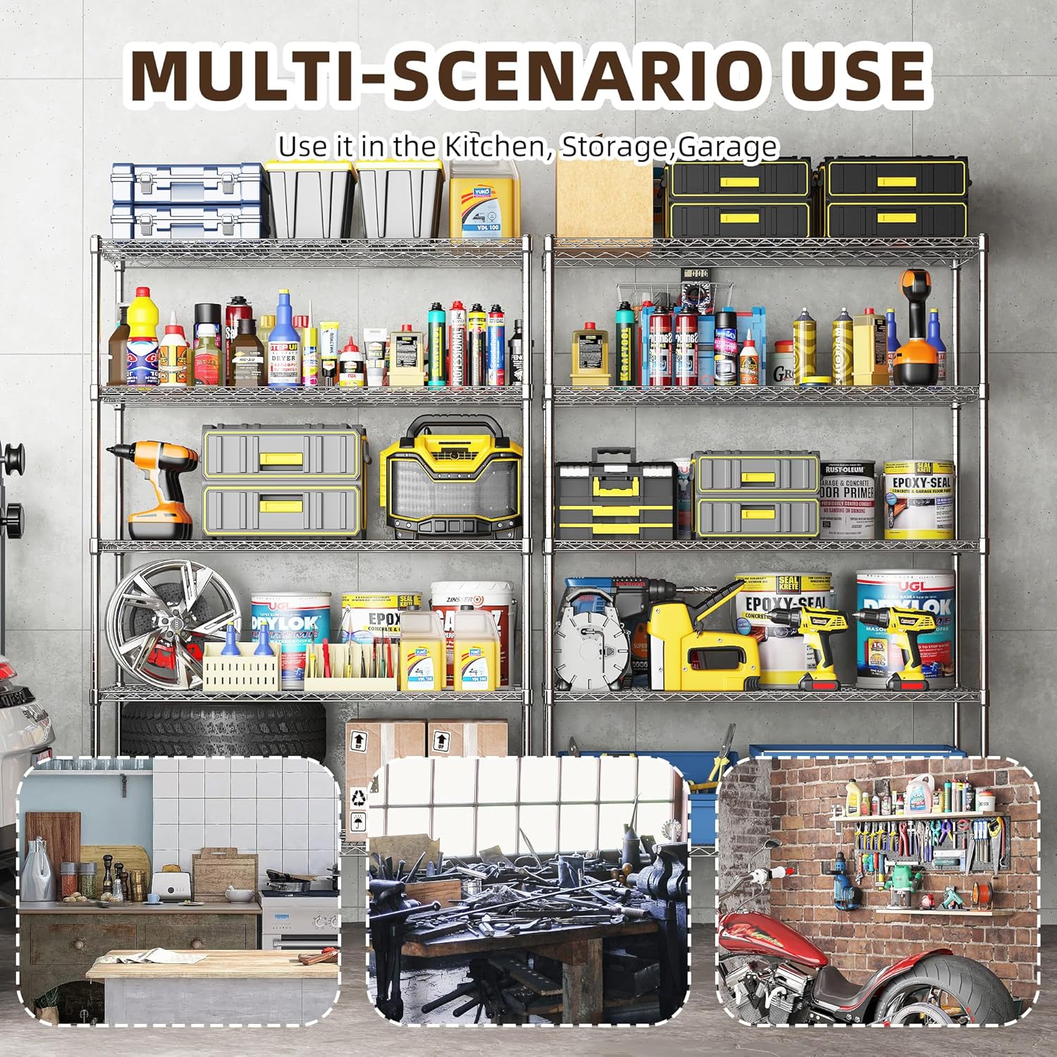 - 【Industrial 5-Tier Wire Shelving】 This metal shelving unit features a robust steel wire construction with chrome plating, ensuring durability and corrosion resistance. Reinforced corner posts and cross-bracing wires distribute weight evenly, perfect for kitchen, pantry, basement and more.