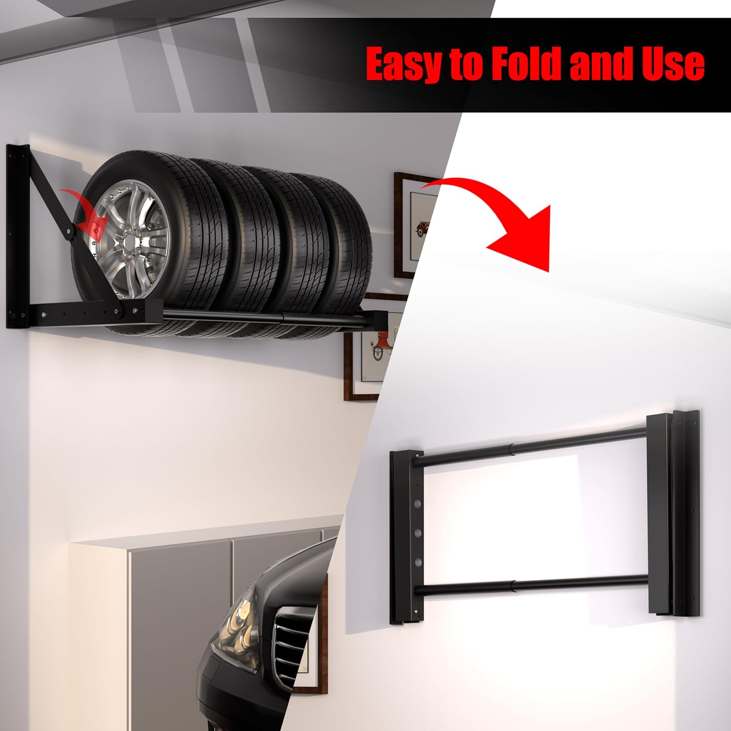 Wall Mount Folding Tire Rack, 32 to 48 Inches Wide Adjustable Tire Storage Rack, Heavy-Duty Steel Tire Storage Rack for Garage ,Workshop, Repair Shop, Supports 400 Pounds and Folds Flat