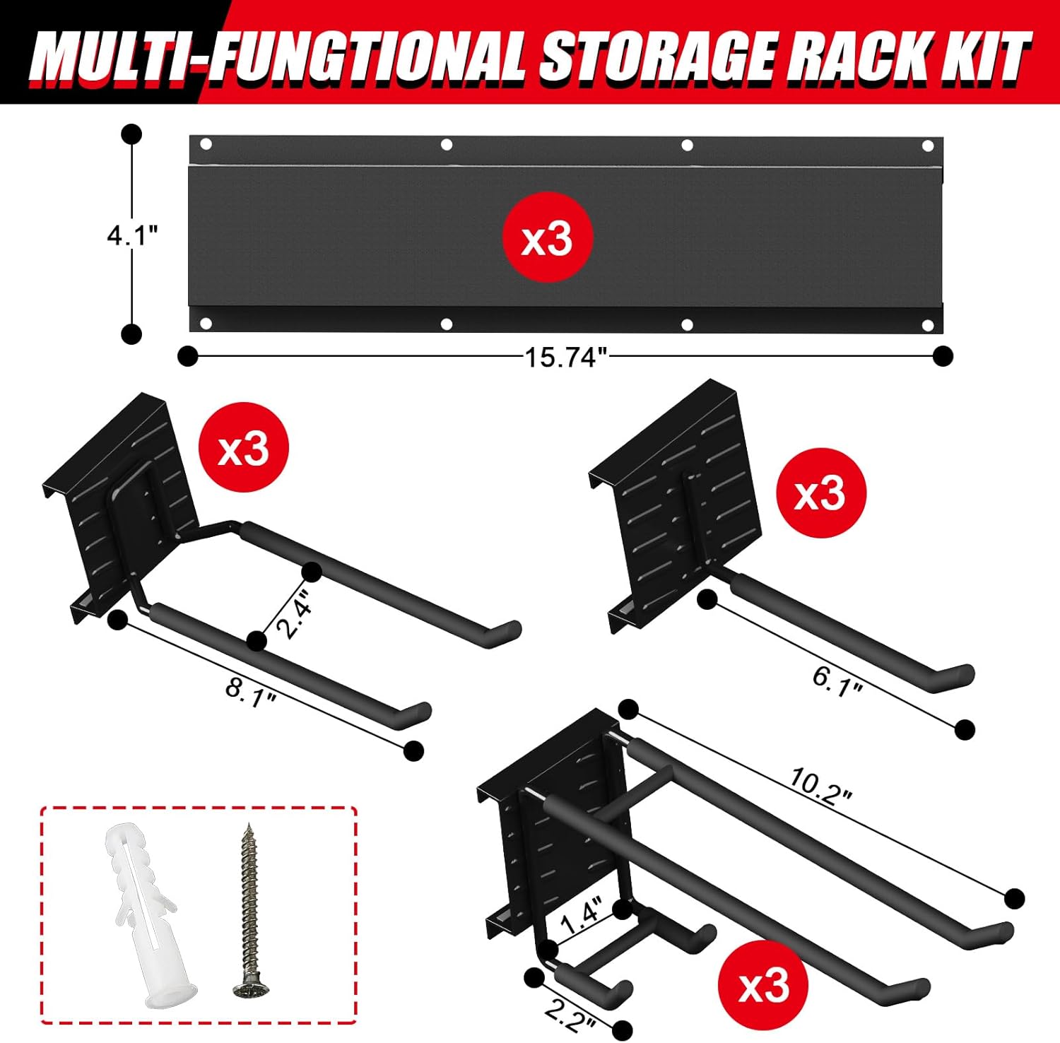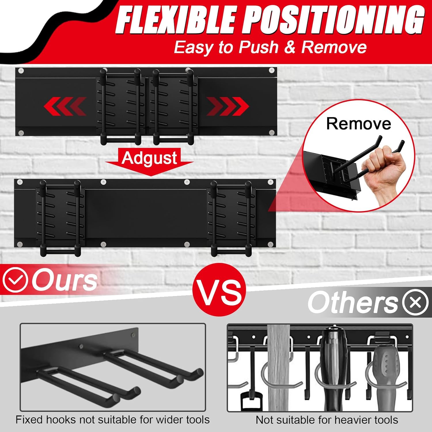 - 48-inch Adjustable Garage Wall Tool Rack: Measuring 48 inches in length, this wall-mounted organizer comes with 9 flexible hooks (3 tool hooks, 3 double-layer hooks, 3 single hooks) and 3 sliding rails. The hooks glide smoothly along the rails, letting you rearrange them in seconds to fit tools of all sizes. Maximize vertical space and save floor space.