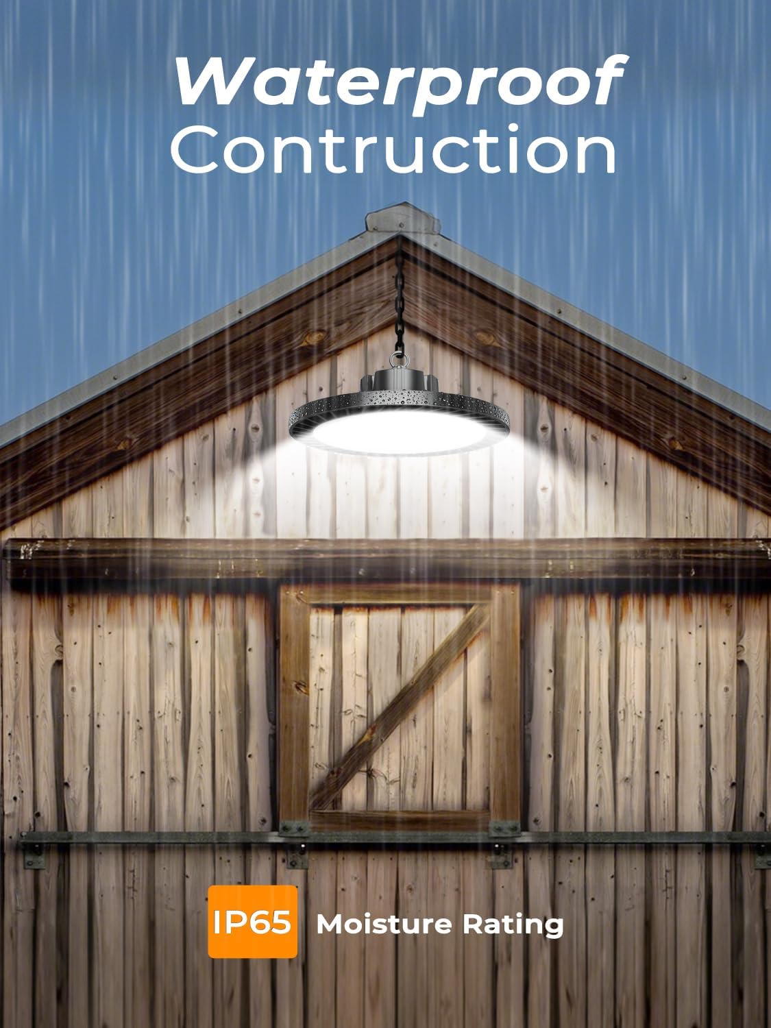 - Easy & Versatile Installation:High Bay Led Lights Includes 5 inch US plug (120V-277V wide voltage), hanging hooks, and safety cable. Effortlessly mount these Garage Lights or High Bay Lights in warehouses, workshops, barns, gyms, and more.