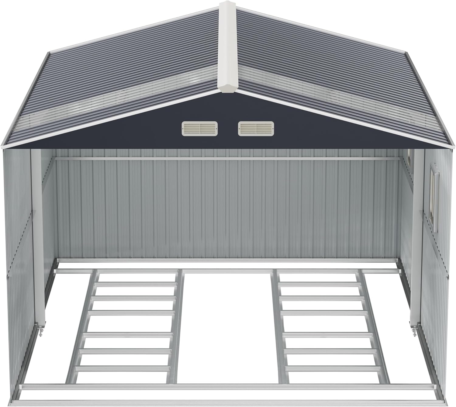- Steel shed includes 2 crystal-clear polycarbonate roof panels that flood the interior with natural light, creating a bright and airy storage space