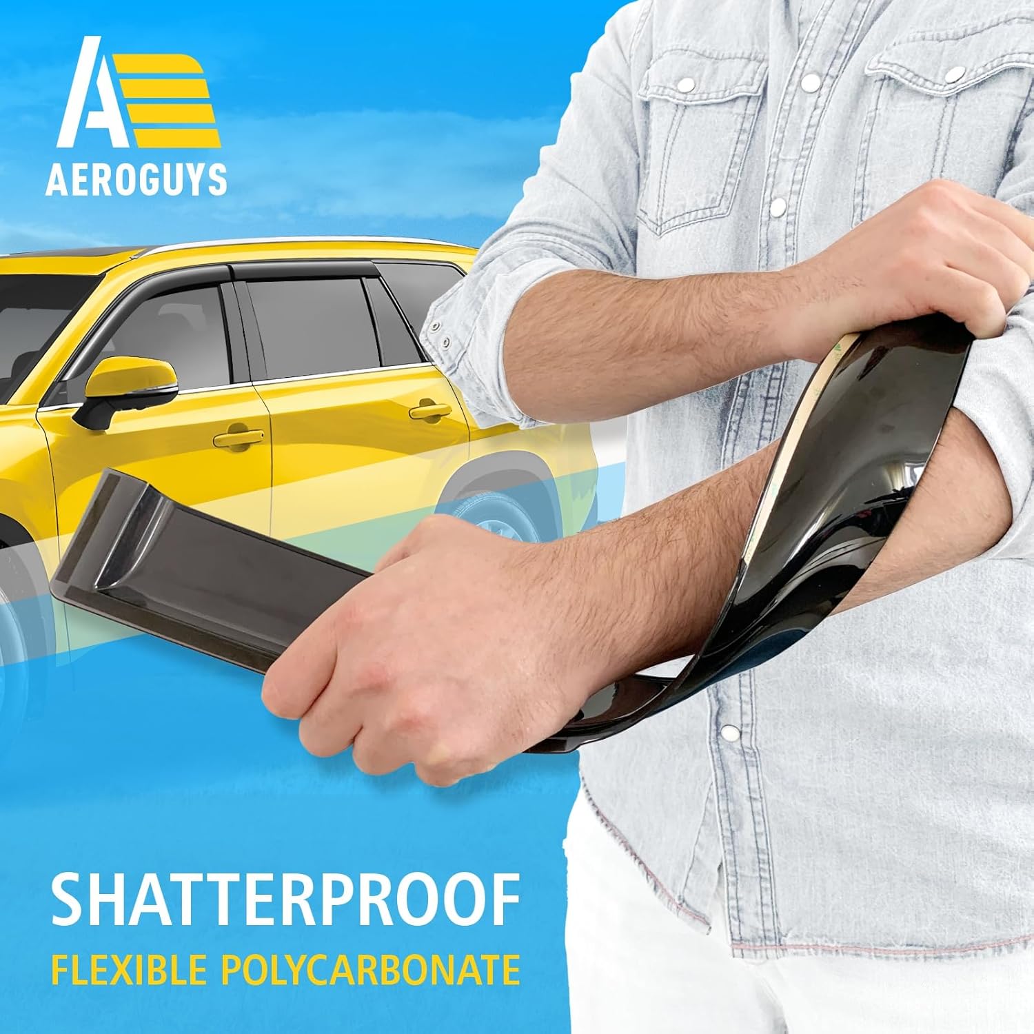 - Incredibly Durable AEROGUYS Auto Window Deflectors – They are made with strong and tough polycarbonate which is clear and scratch-resistant. They also provide UV protection making your ride more comfortable under all weather conditions.