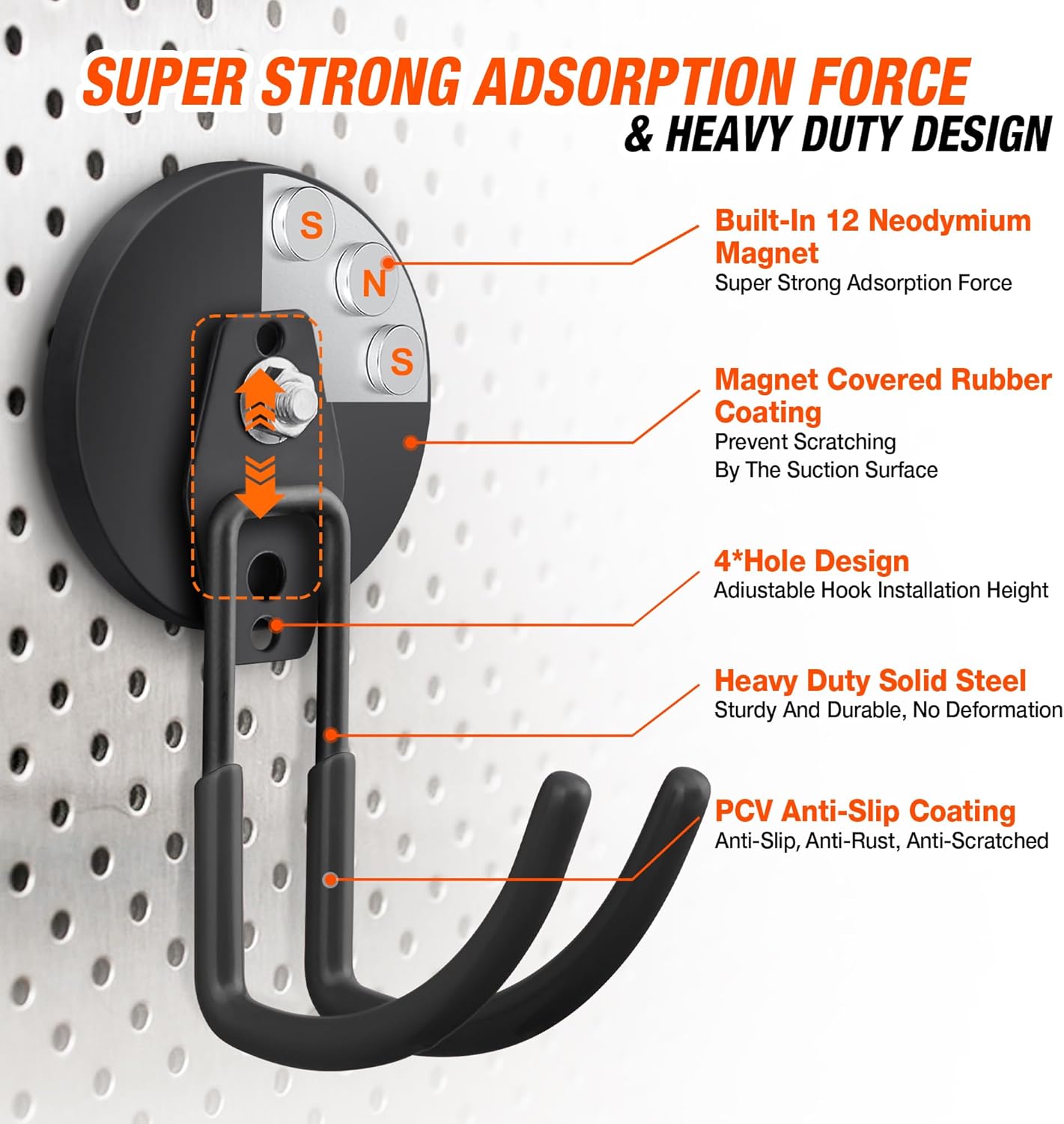 - 🧲[2PCS Magnetic Hooks For Hanging] Large strong magnetic hook present an efficient solution for optimizing vertical storage space within your garage organization system. These multifunctional extra magnet storage hooks are suitable for both indoor and outdoor settings, including garages, gardens, kitchen, warehouse, cruise cabin, utility rooms and indoor/outdoor