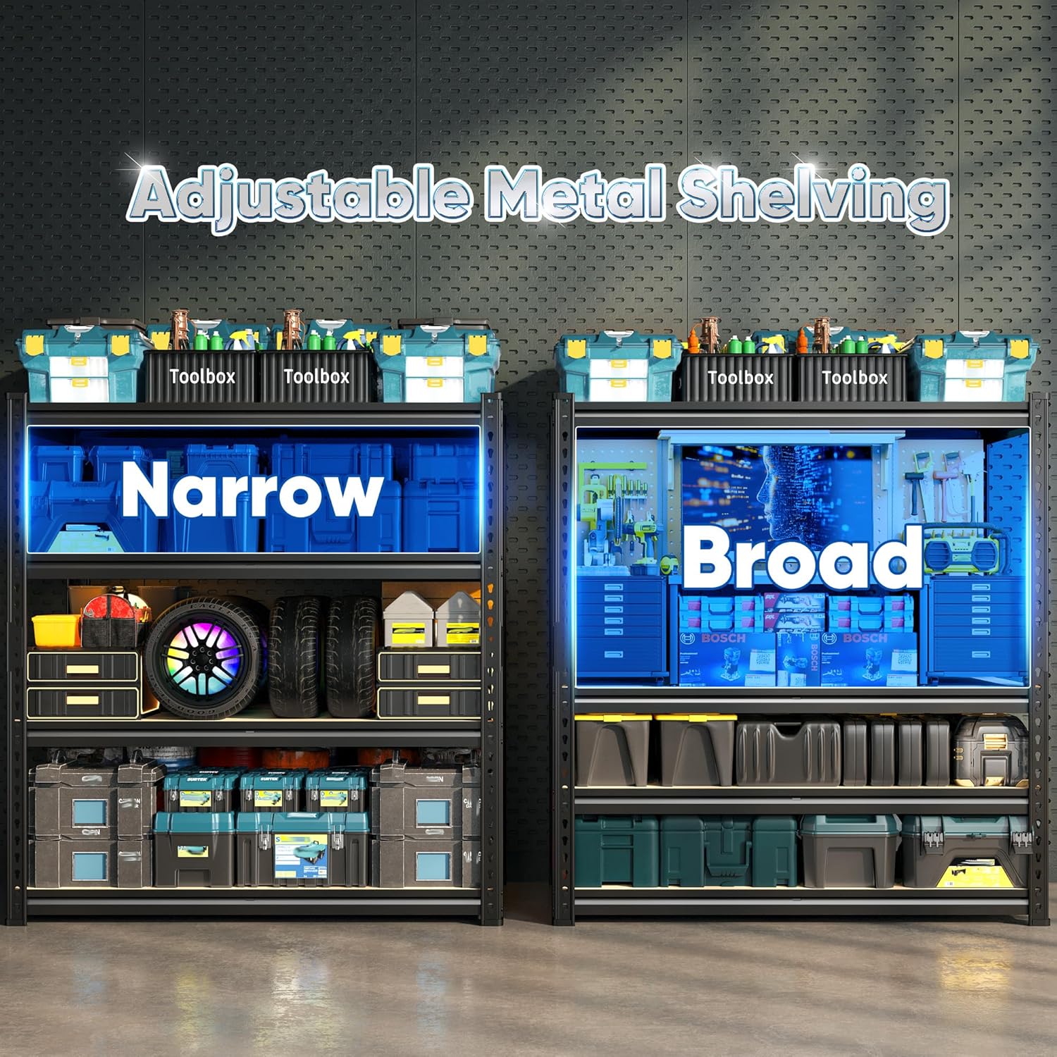 - 【Adjustable Garage Shelves】The height of this shelving unit is adjustable. You can move the shelves up and down to optimize space utilization and meet various storage needs. Additionally, it can be split into two separate units that function as workbenches