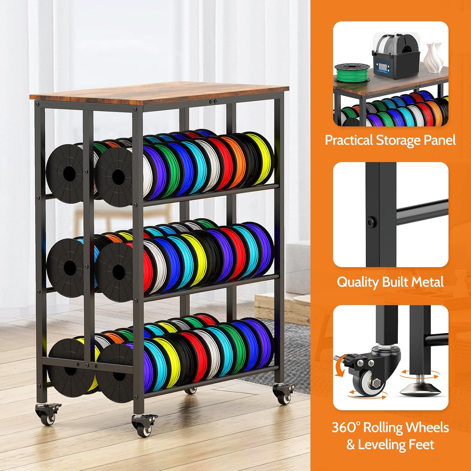 - LARGE CAPACITY & ADJUSTABLE ROD SPACING:Ormeli 3-tier 3d filament metal cart holds up to 60 spools of different materials. The bottom tier features adjustable rod spacing to accommodate spools of all sizes. Unlike storage boxes or cabinets, it lets you easily track filament colors and materials on hand, with quick access that eliminates bending over or rummaging through drawers.