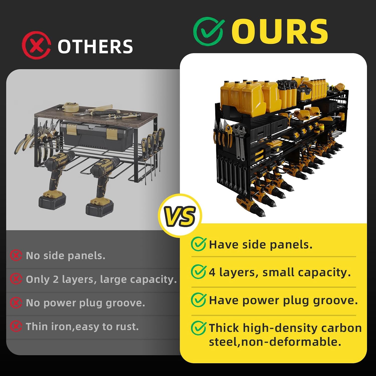 - 🔧【LARGE CAPACITY&SIDE PLATE】This wall-mounted power tool organizer is more storage space than standard tool racks.It has 4-layer high-capacity design and 12 cordless drill holders and 2 side-plates, great for storge electric drills/power drivers/impact wrenches/mpact drills/cutters/angle grinders and other handheld power tools.The 4-layer can hold batteries, saws,wrenches,chargers and other tools, and the side racks can hold wrenches/screwdrivers/hammers/pliers, scissors, etc.