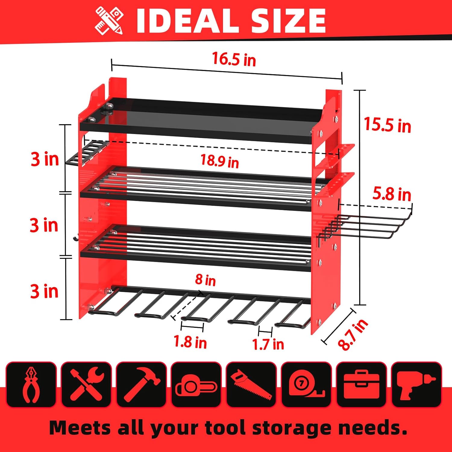 - 🧰【EASY TO ASSEMBLE】Our cordless tool organizer is Quick 10-15 min setup (clear instructions included), a perfect power tool rack for your workshop,only need to connect the plate with screws and hang it on the wall.We provide clear installation instructions and accessorie,Installation size: 33 in (L) × 8.7 in (W) × 15.5 in (H),4 Pcs additional 5.8" detachable hooks are included.