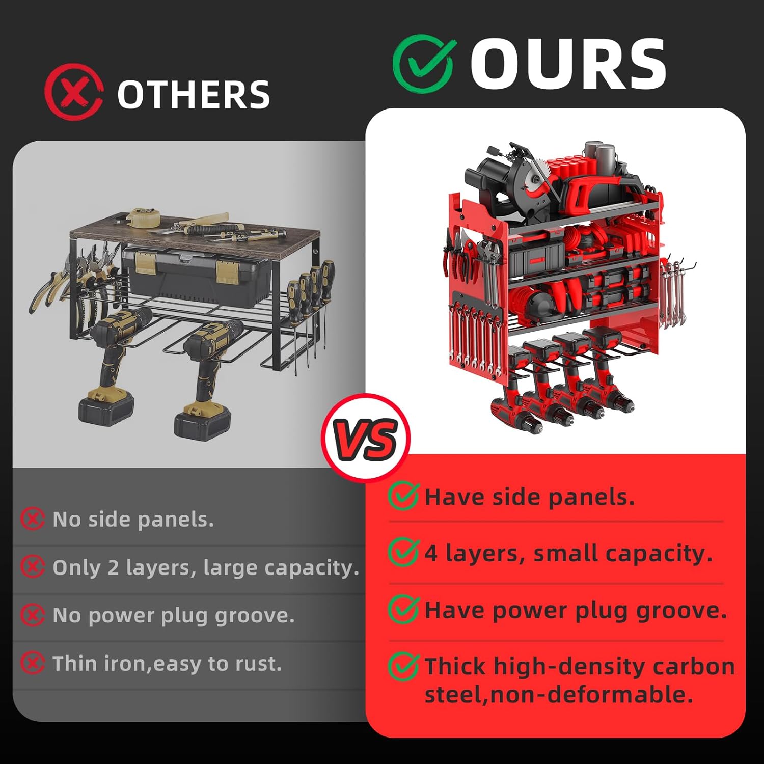 - 🔨【400 POUNDS LOAD】This heavy-duty power tool organizer is made of heavy-duty metal and protective coating,scratch-resistant, rust-resistant and anti-bending,no need to worry about the shelf breaking or falling off the wall. The wall mount design saves valuable floor space while keeping tools within reach,say goodbye to a messy workspace,put your tools all in a row.