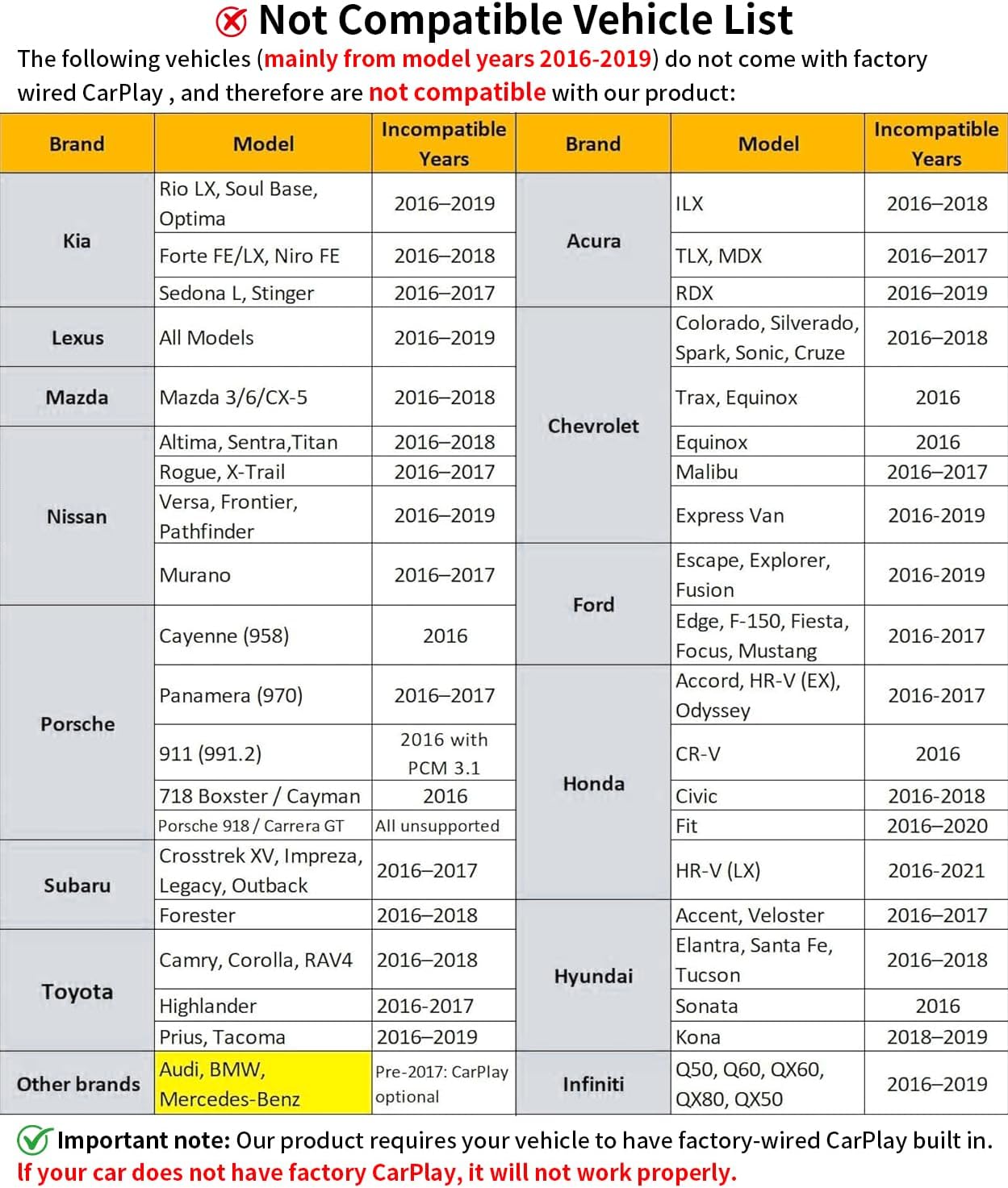 - Compatible Devices : Cars from 2016+ with wired CarPlay, Cars from 2016+ with wired CarPlay,iPhone 6, iPhone 6 Plus, iPhone 6s, iPhone 6s Plus, iPhone 7, iPhone 7 Plus, iPhone 8, iPhone 8 Plus, iPhone X, iPhone XR, iPhone XS, iPhone XS Max, iPhone 11, iPhone 11 Pro, iPhone 11 Pro Max, iPhone SE (2nd generation), iPhone 12, iPhone 12 mini, iPhone 12 Pro, iPhone 12 Pro Max, iPhone 13, iPhone 13 mini, iPhone 13 Pro, iPhone 13 Pro Max, iPhone SE (3rd generation), iPhone 14, iPhone 14 Plus, iPhone 14 Pro, iPhone 14 Pro Max, iPhone 15, iPhone 15 Plus, iPhone 15 Pro, iPhone 15 Pro Max, iPhone 16, iPhone 16 Plus, iPhone 16 Pro, iPhone 16 Pro Max.,Apple iPhone 6 and above series with iOS 10+ versions, iOS 12+ Cars from 2016+ with wired CarPlay, Cars from 2016+ with wired CarPlay,iPhone 6, iPhone 6 Plus, iPhone 6s, iPhone 6s Plus, iPhone 7, iPhone 7 Plus, iPhone 8, iPhone 8 Plus, iPhone X, iPhone XR, iPhone XS, iPhone XS Max, iPh… See more